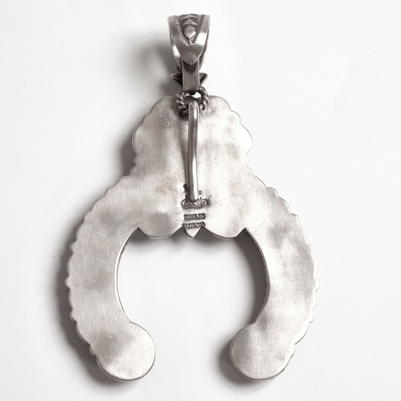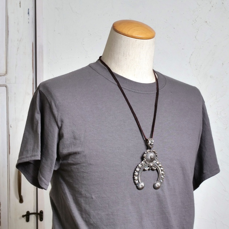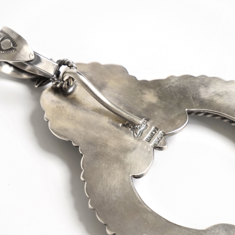 デルバートゴードンのハンドメイドビッグナジャペンダントです。一つ一つのパーツをカットし、貼り合わせデザインするアップリケ技法で立体的に装飾された1点。シルバーをふんだんに使いずしりと重厚、バチカンなど細部まで手の込んだ超特大ペンダント。これほど装飾をほどこされたナジャは他にはないと言っても過言ではないでしょう。トップのバチカンは背面フックに引っ掛けてある仕様で、なんと取り外し可。フックでチェーンにかけ、バチカンはレザーコードなどでドロップ型ペンダントとして使うのもありかも。かなり重量があるので、通すチェーンもかなり頑丈なもの、または丈夫なレザーなどをおすすめします。