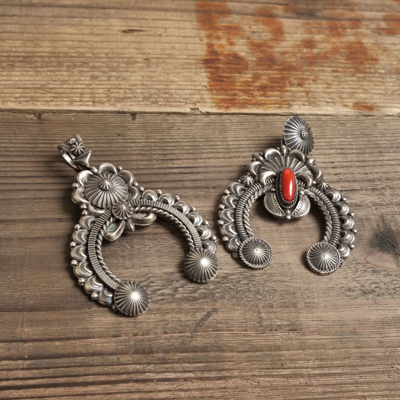 | ご注意 | ※ハンドクラフト特有のゆがみ・ずれ等がある為、表記サイズには多少の誤差がございます。 ※銀は経年で硫化する為、画像より黒ずみが増える、またはより綺麗に磨かれてのお届けとなる場合がございます。 ※インディアンジュエリーは伝統的な手仕事による製法上キズ・銀面のムラ・接合のラフさなどが多く見られるジュエリーです。味わいのうちとしてお楽しみください。 |