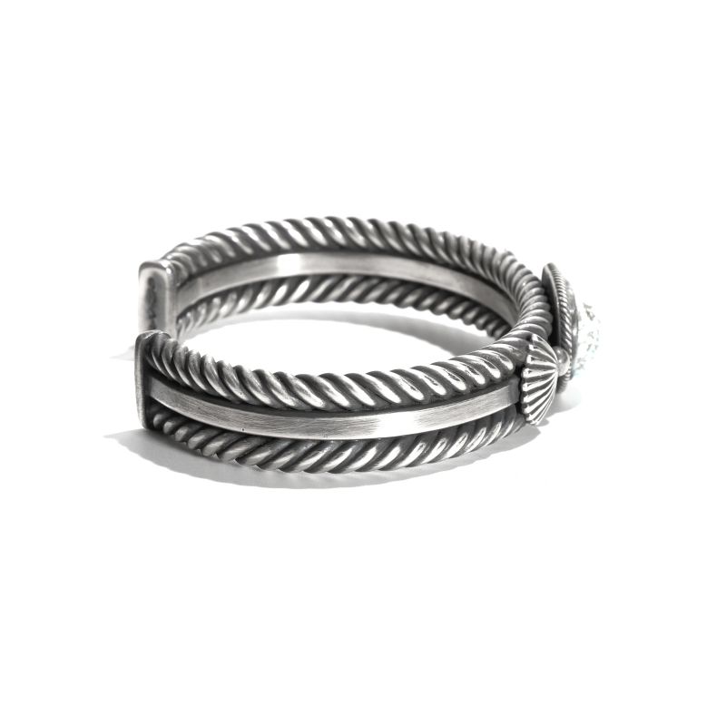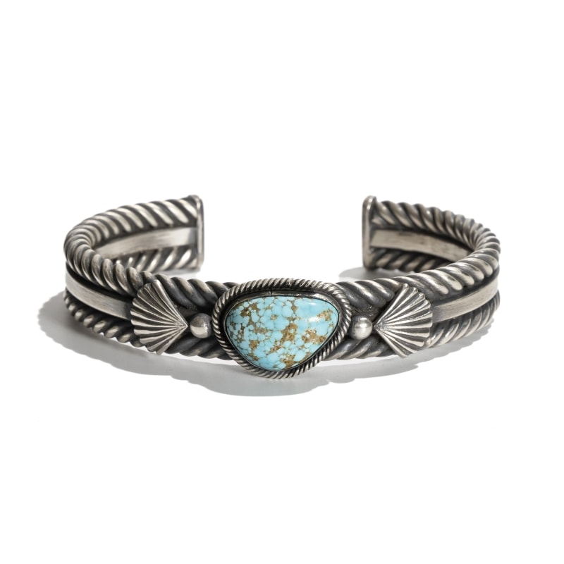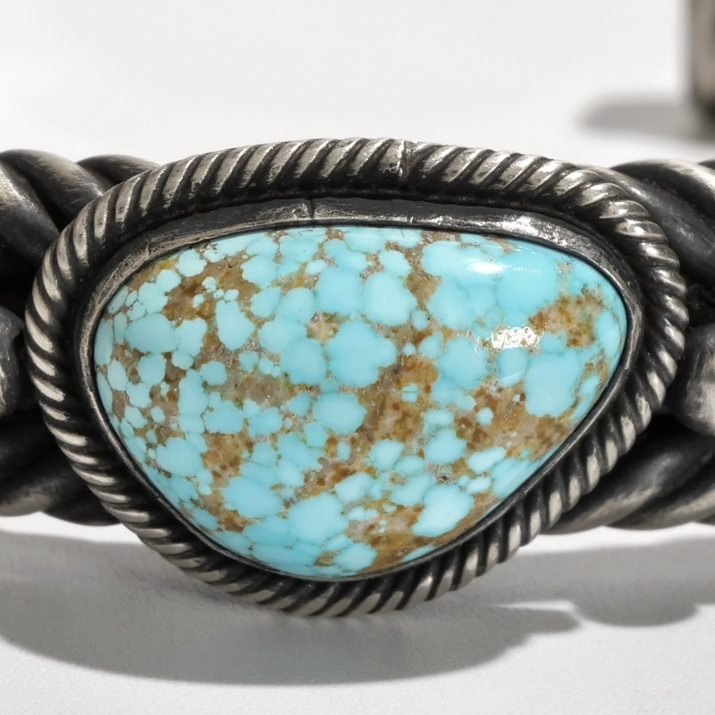 スティーブアルビソのヘヴィケーブルバングルです。トップには厚みのある大粒のナンバーエイトターコイズ、釉薬のような透明感のある水色にゴールドベージュのマトリックスが混じるハイグレードな石です。アームは艶消し・いぶし強めで重厚感のあるケーブルワイヤーを使用、これはアーティスト自らねじり上げて作っているもの。サイドにはナバホの儀式で使うファン(羽根の扇)モチーフが施され、重厚で雰囲気がありながらコーディネートを選ばないジュエリーとなっています。手首周り19cm対応のなかなかない特大サイズ。