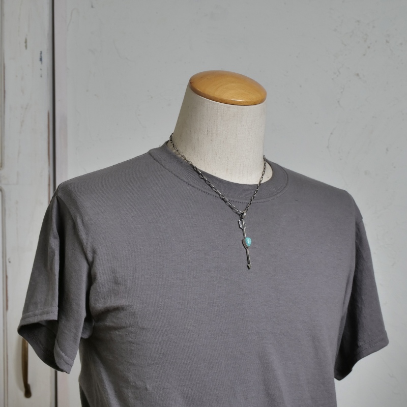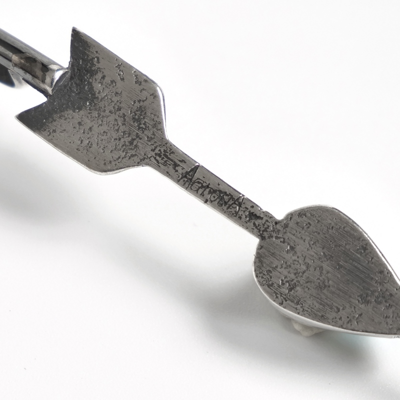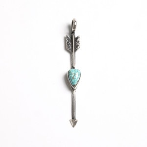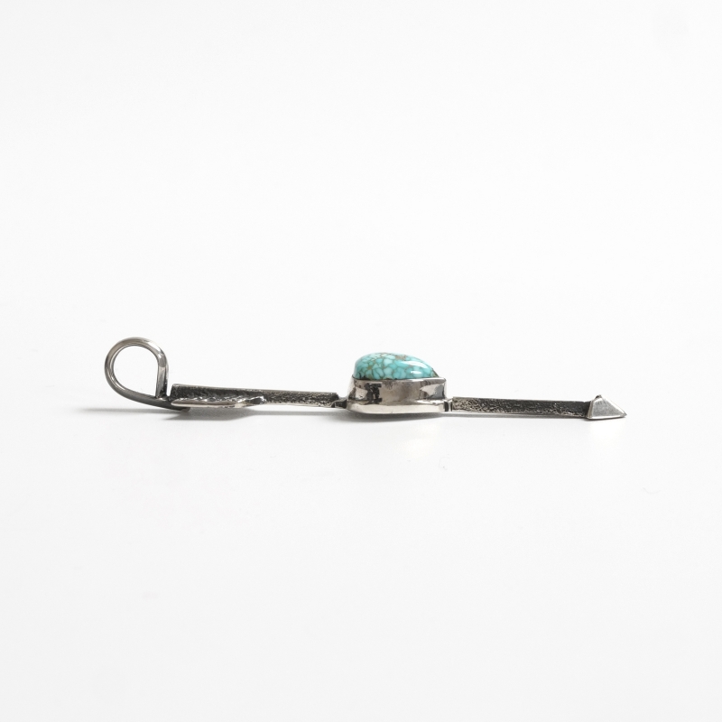 アーロンアンダーソンのトゥファキャストペンダントです。守りの象徴であり、狩りの道具であり、平和や友好の象徴でもある”アロー”を彫り出し、繊細なナンバーエイトターコイズを嵌めています。石の上下にアローパーツを溶接するのではなく、この石を嵌める前提でアローと石の形を一体としトゥファストーンに彫りこんでいるのは、Master of Tufaと呼ばれるアーロンの一見ではわからないこだわり。矢羽根の繊細なテクスチャ、アローヘッドのエッジ、細かい表現が難しいトゥファキャストで細部まで神経が行き届いた表現力と技術、小品ながらアーロンアンダーソンの経験とセンスが凝集している良品。