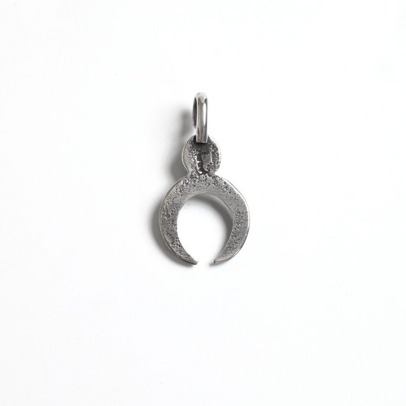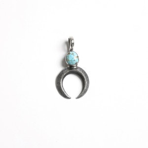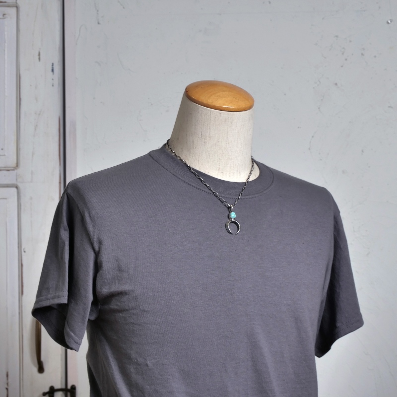アーロンアンダーソンのトゥファキャストのペンダントです。ナバホのお守りである”ナジャ”の究極シンプリファイドモデルに、ハニーウェブの入ったナンバーエイトターコイズをあしらっています。石の下にナジャパーツを溶接するのではなく、この石を嵌める前提でナジャと石の形を一体としトゥファストーンに彫りこんでいるのは、Master of Tufaと呼ばれるアーロンの一見ではわからないこだわり。洗練されたカーブ、細部まで神経が行き届いた表現力と技術、シンプルな造形にアーロンアンダーソンの経験とセンスが凝集している1点。
