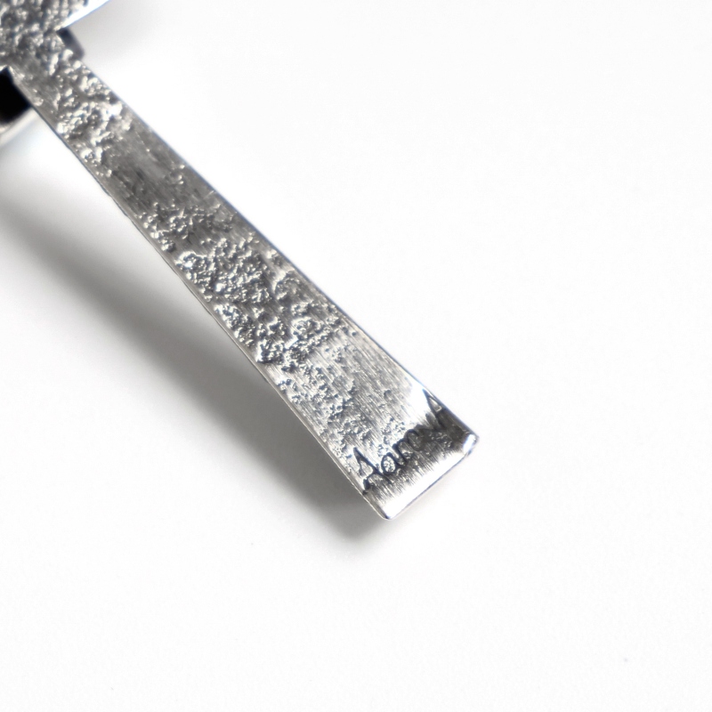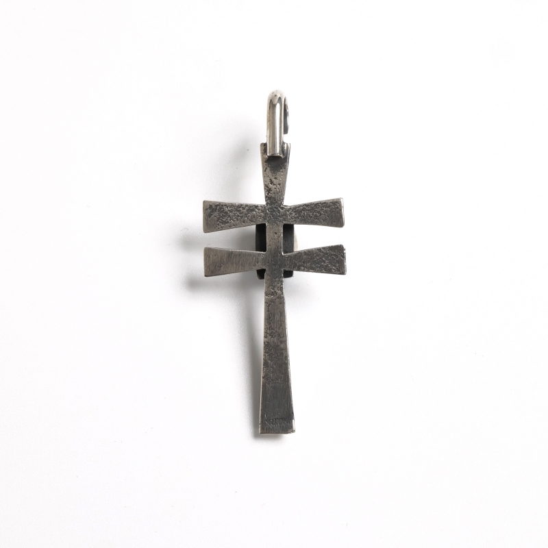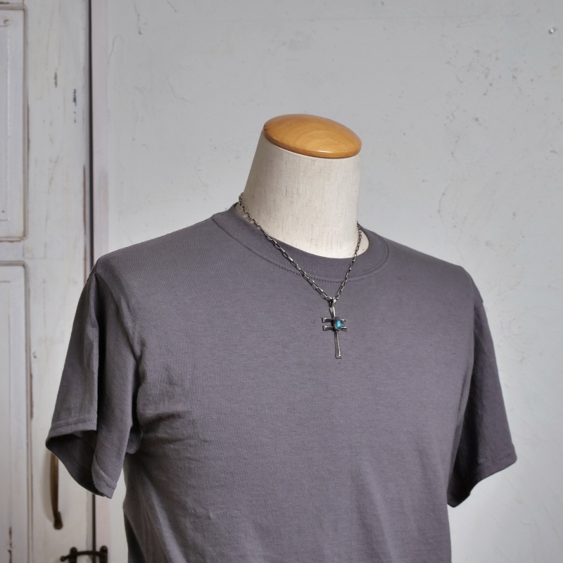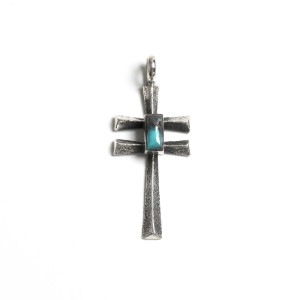 アーロンアンダーソンのトゥファキャストペンダントです。ナバホではドラゴンフライ=蜻蛉に見立てられ『導くもの』の意味を持つダブルクロスモチーフに、四角いスモーキービスビーターコイズをあしらっています。繊細に丁寧にトゥファストーンを彫ったことが分かるエッジの立ったクロス、要所要所磨き上げた鏡面のアクセント。細部まで神経が行き届いた表現力と技術、シンプルな造形にアーロンアンダーソンの経験とセンスが凝集している1点。