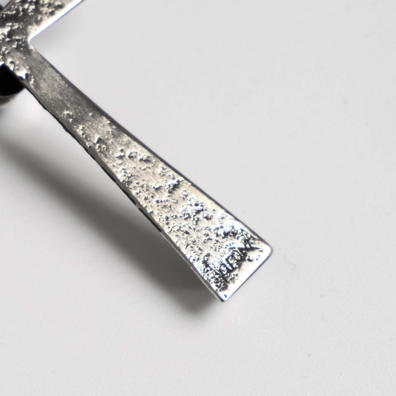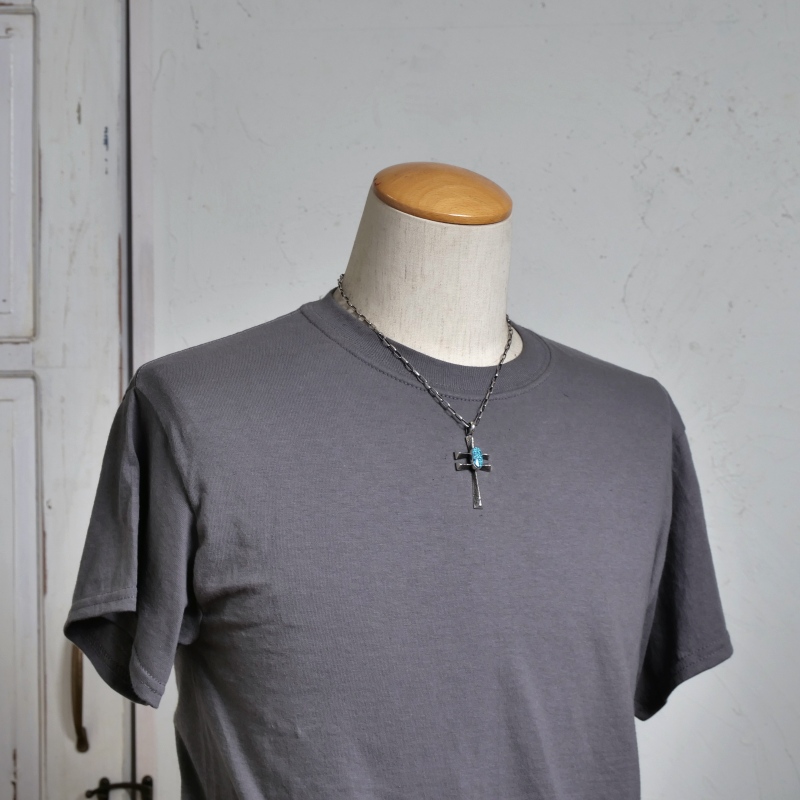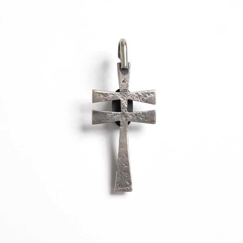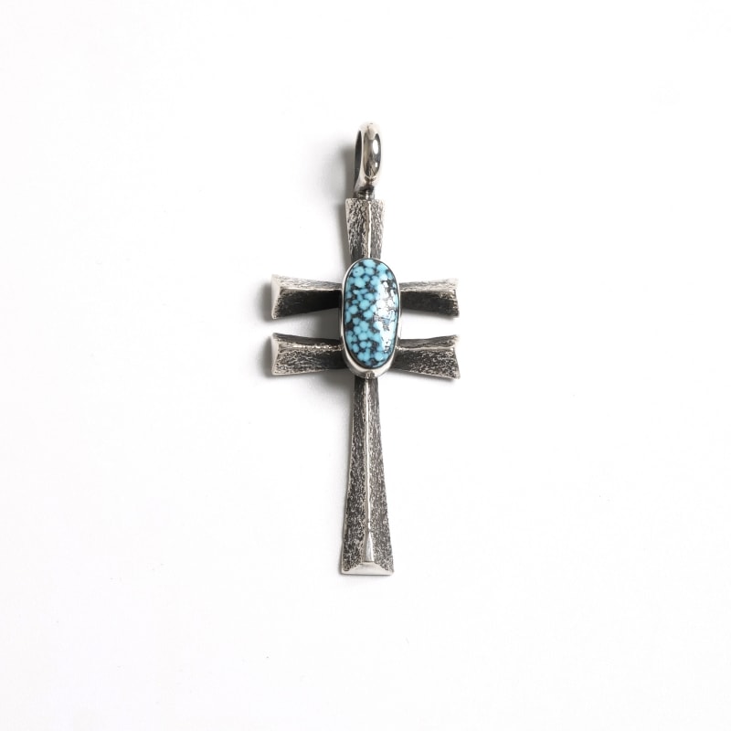 アーロンアンダーソンのトゥファキャストペンダントです。ナバホではドラゴンフライ=蜻蛉に見立てられ『導くもの』の意味を持つダブルクロスモチーフに、ブラックウェブキングマンターコイズをあしらっています。繊細に丁寧にトゥファストーンを彫ったことが分かるエッジの立ったクロス、要所要所磨き上げた鏡面のアクセント。細部まで神経が行き届いた表現力と技術、シンプルな造形にアーロンアンダーソンの経験とセンスが凝集している1点。
