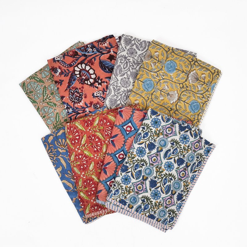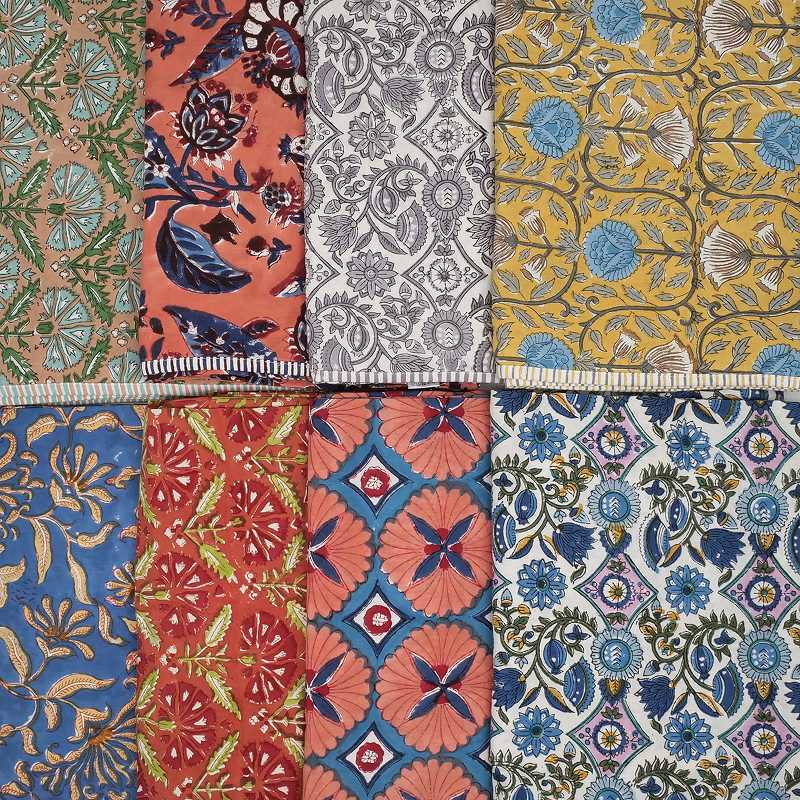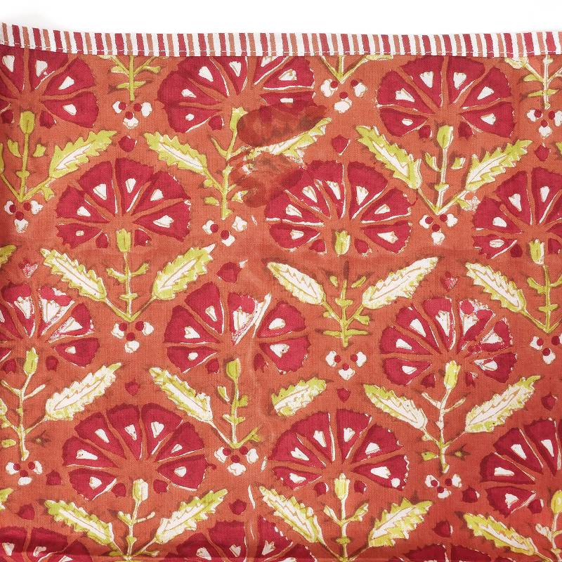 | 特記事項 | ※プリントの中に版のズレ(切れ目)や染料が擦れた箇所、にじみがございますがブロックプリントの特徴によるものです。 ※色の濃淡や色味の違いがある場合がございます。特にタイプ1はベースの色味がオレンジに近いものと赤に近いものがございますが、お選びいただくことはできません。 |