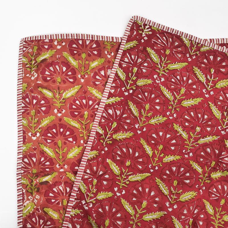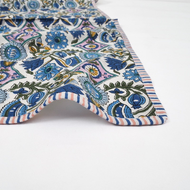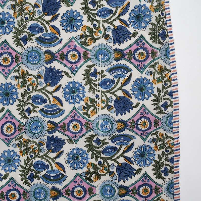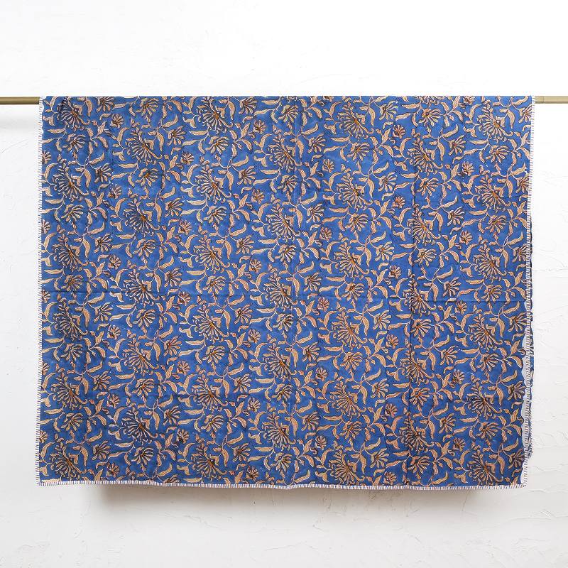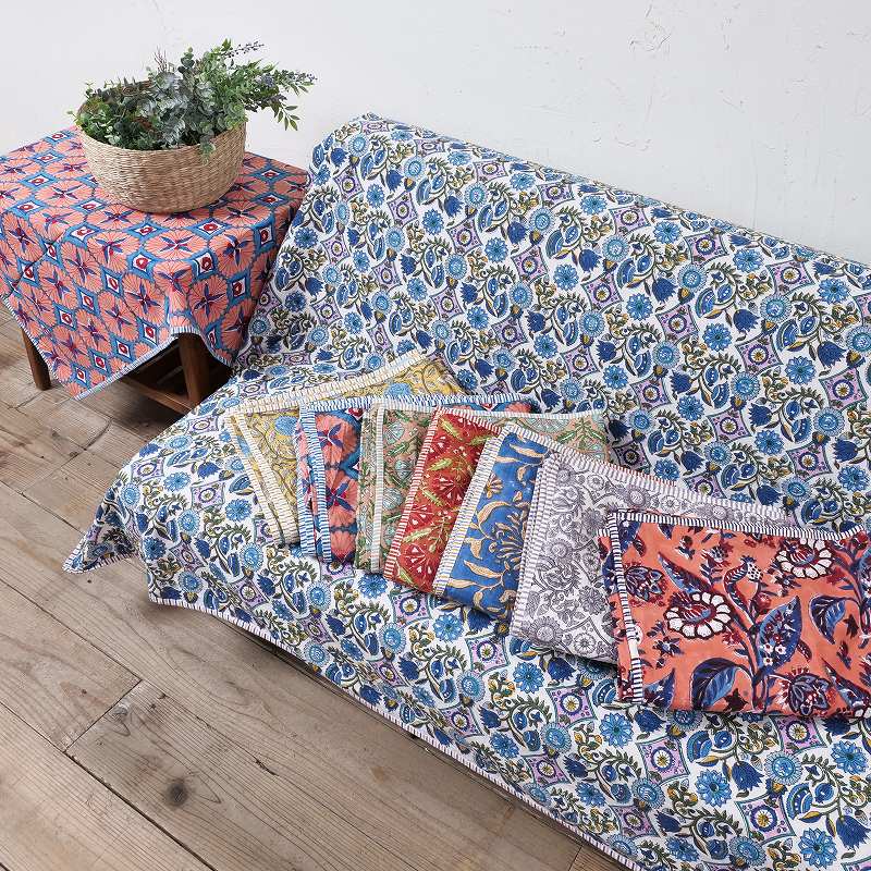 植物をモチーフにしたインドらしいブロックプリントが魅力のファブリック。インド、ラジャスタン州にあるサンガネールという地域伝統のブロックプリント(木版染め)で、職人が一版一版ていねいに手作業でプリントを施しています。白い生地に施される鮮やかな配色や草木などをモチーフにした華やかな模様が特長。ストライプ柄のパイピングがアクセントに。長方形のベッドカバーサイズで、マルチカバーとしてお部屋のコーディネートに彩りをプラスしてくれます。