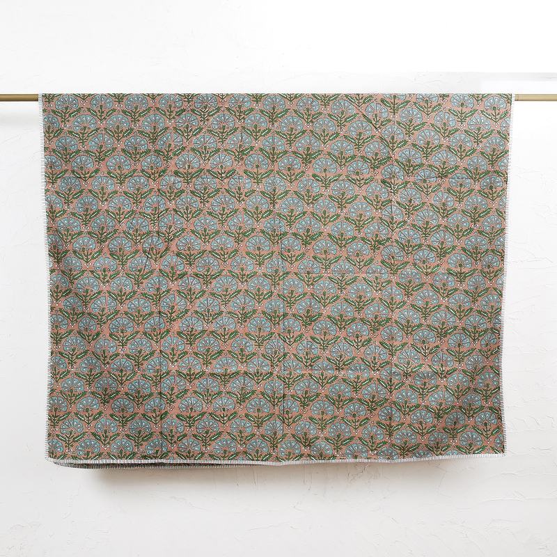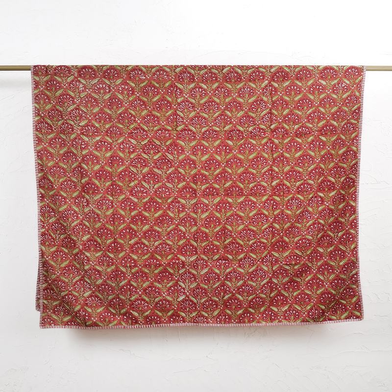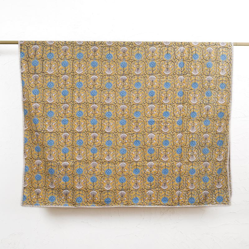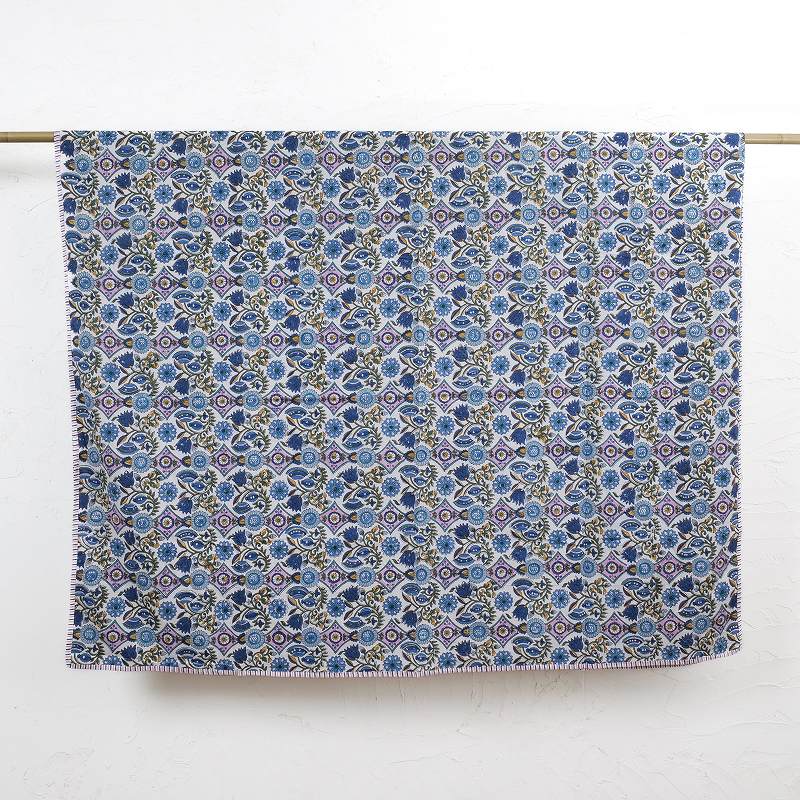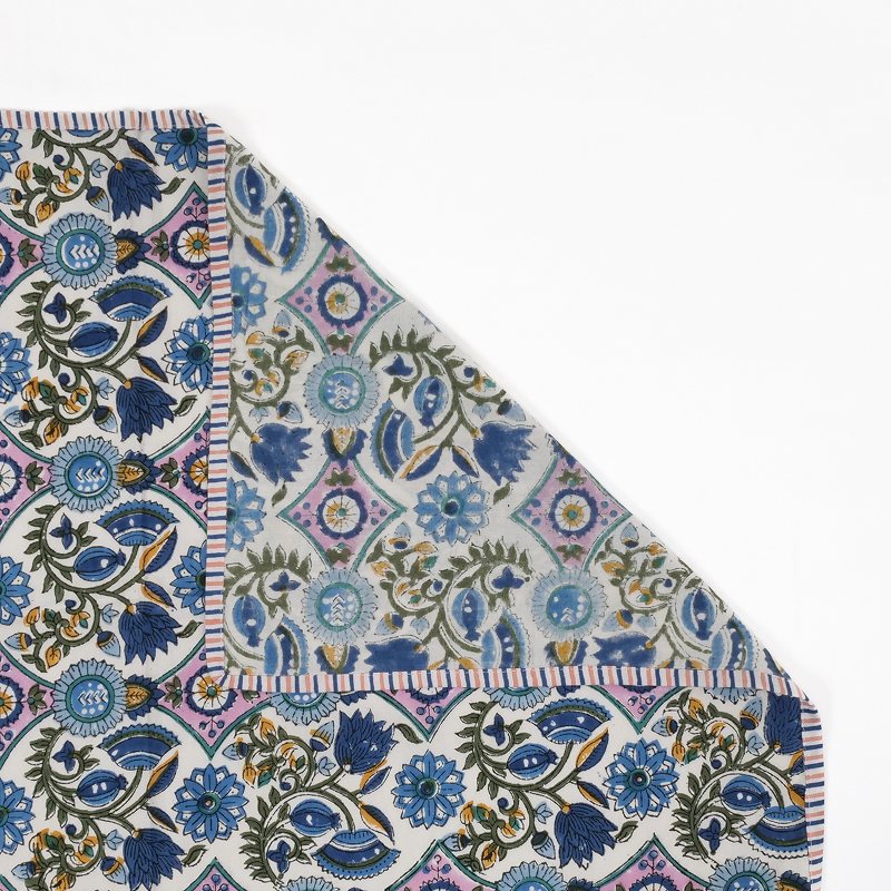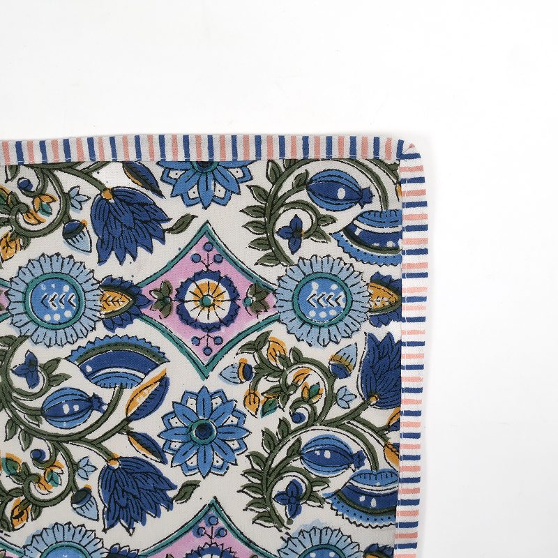 植物をモチーフにしたインドらしいブロックプリントが魅力のファブリック。インド、ラジャスタン州にあるサンガネールという地域伝統のブロックプリント(木版染め)で、職人が一版一版ていねいに手作業でプリントを施しています。白い生地に施される鮮やかな配色や草木などをモチーフにした華やかな模様が特長。ストライプ柄のパイピングがアクセントに。長方形のベッドカバーサイズで、マルチカバーとしてお部屋のコーディネートに彩りをプラスしてくれます。