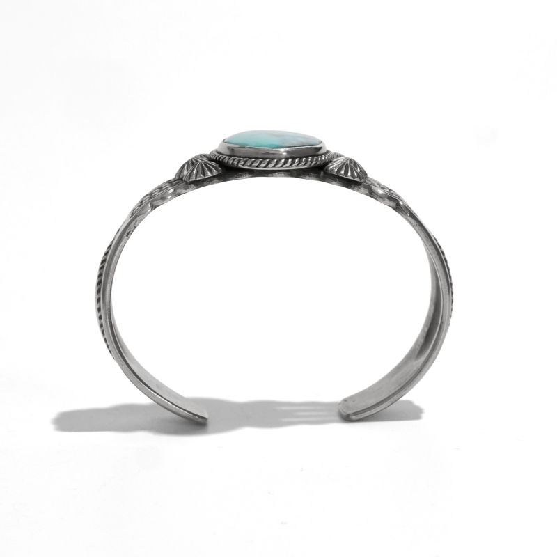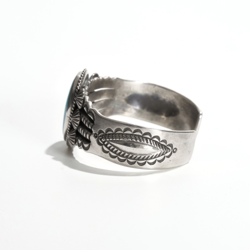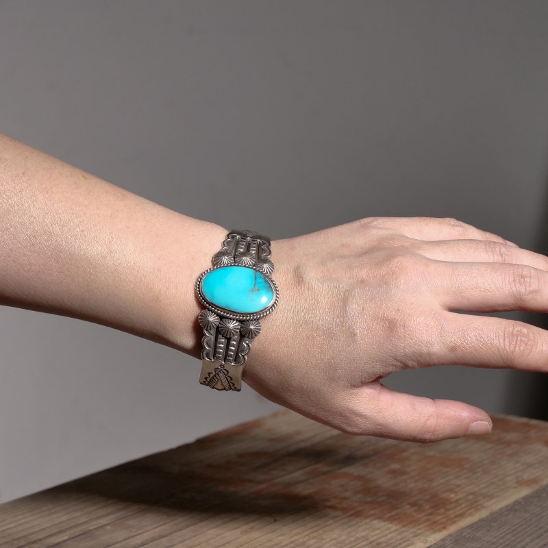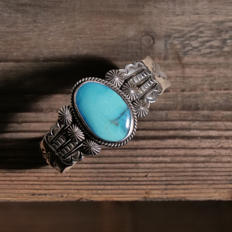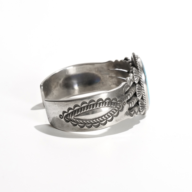 ペリーショーティのコインシルバーバングルです。鮮やかなブルーの貴重な大粒ビズビーターコイズを使用、古い銀貨を溶かし鍛造したコインシルバーで特別オーダーした1点。ビズビーは濃いブルーのグラデーションが美しく、端ににじむグレーのマトリックスがアクセントに。ペリー作品では大変珍しい石使いです。ブレスレットアームはもちろんコンチョ・ワイヤー・ベゼル全てをコインシルバーで仕立てているこだわりぶり、サイドにリーフモチーフのリポウズ、スプリットシャンクのクラシカルなデザイン。シルバーは程よい厚みで上品、硬く扱いが難しいコインシルバーをここまで端正に仕立てられるのは流石のひとことです。長年使うことでその魅がさらに増す、一生のジュエリーとしてぜひ。