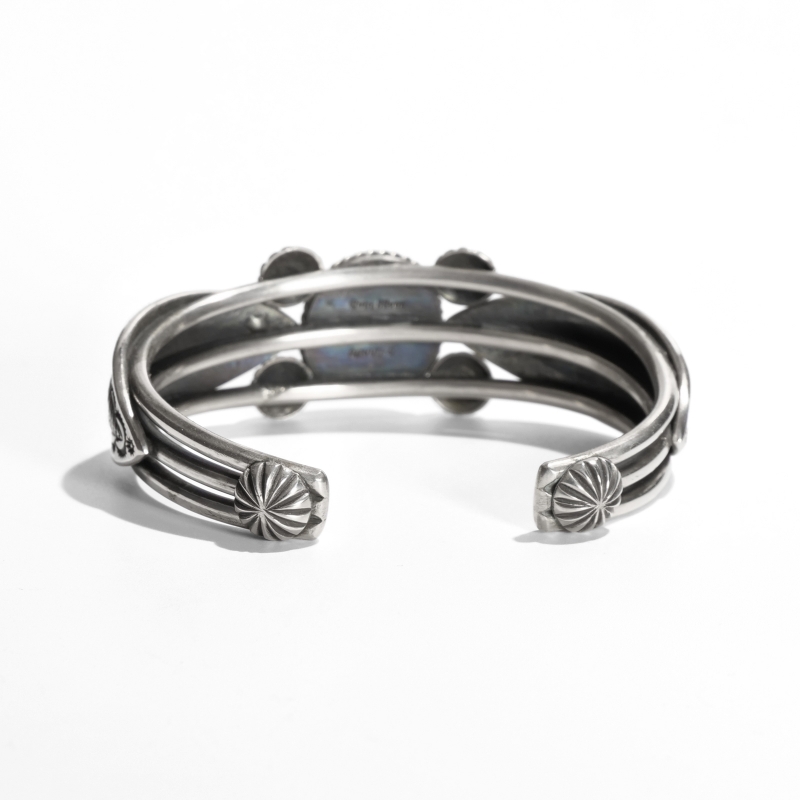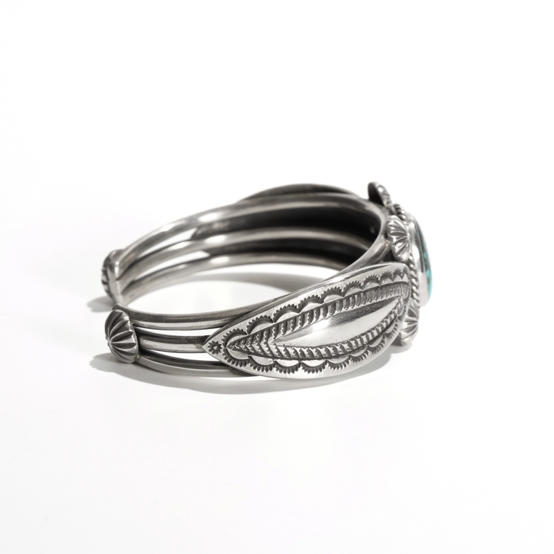 ペリーショーティのコインシルバーバングルです。スパイダーウェブと深緑のグラデーションが美しいハイグレードローンマウンテンターコイズを使用、古い銀貨を溶かし鍛造したコインシルバーで特別オーダーした1点。ワイヤーのバングル作品は通常スターリングシルバーを使用しますが、今作はワイヤー・コンチョ・ベゼル全てのパーツをコインシルバーで特注した非常にレアな逸品。ワイヤー一本の制作も、銀貨を溶かし伸ばしたものを丸い穴に何度も何度も通して形成した『ものづくり』の結晶のような1点です。トップとエンドにはコンチョ、サイドにはリーフモチーフのリポウズ、硬く扱いが難しいコインシルバーをここまで端正に仕立てられるのは流石のひとこと。長年使うことでその魅がさらに増す、一生のジュエリーとしてぜひ。