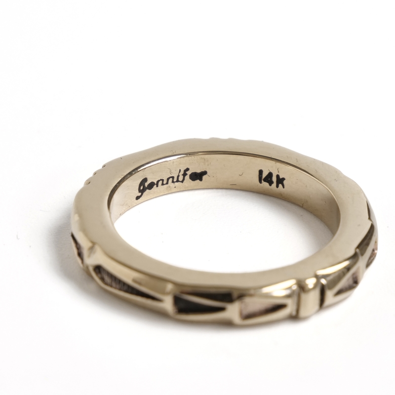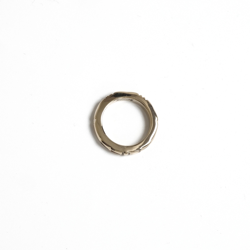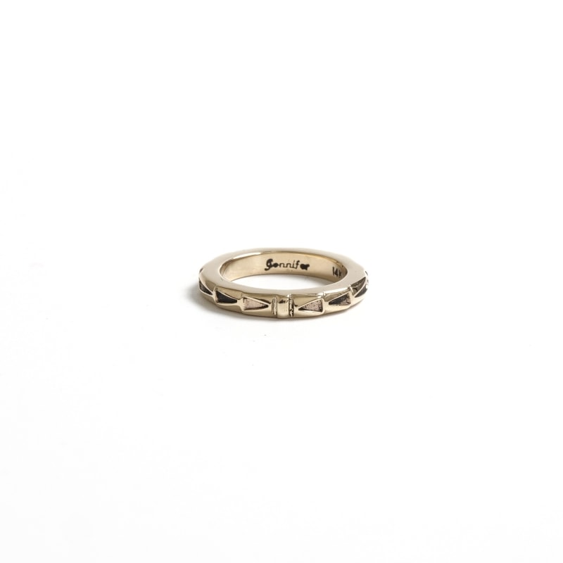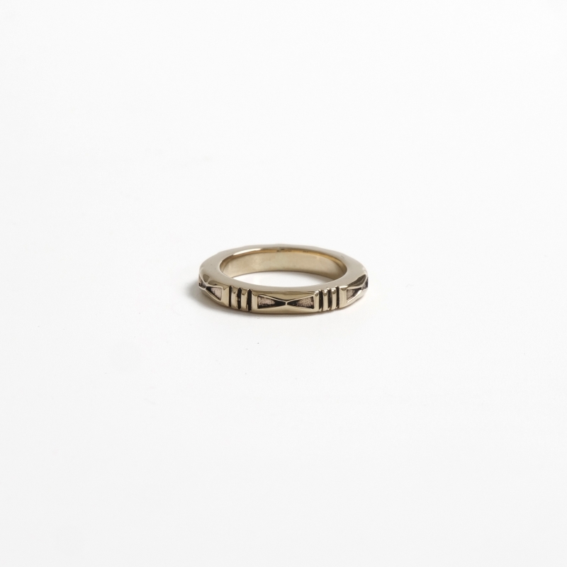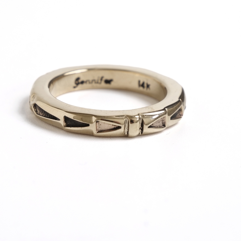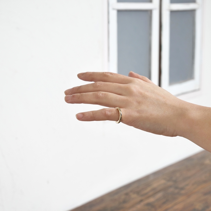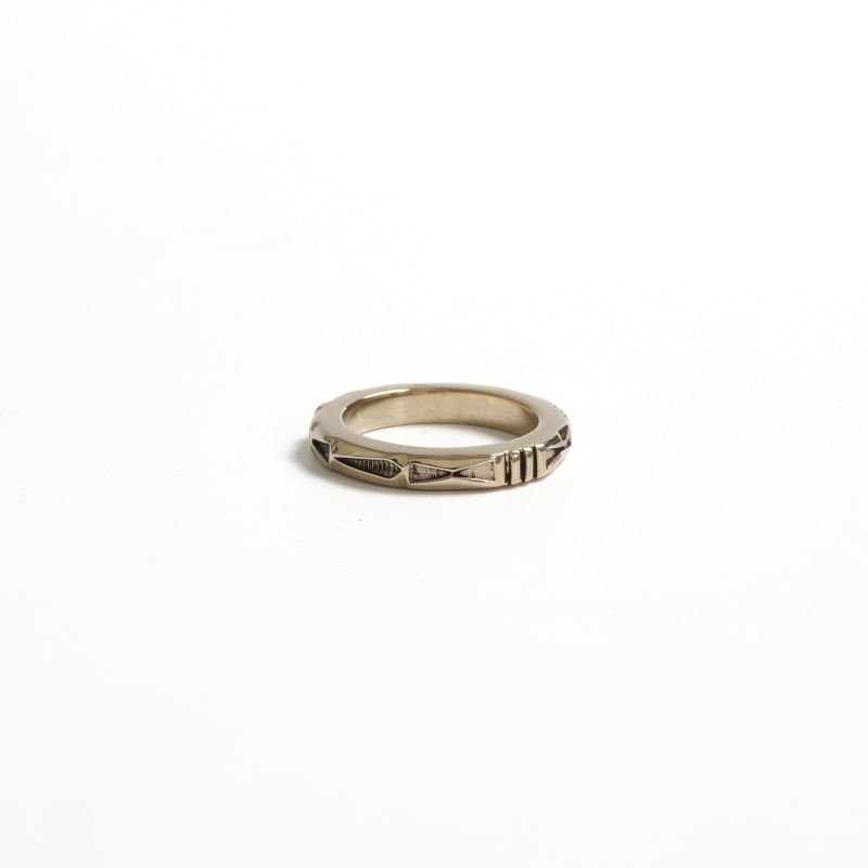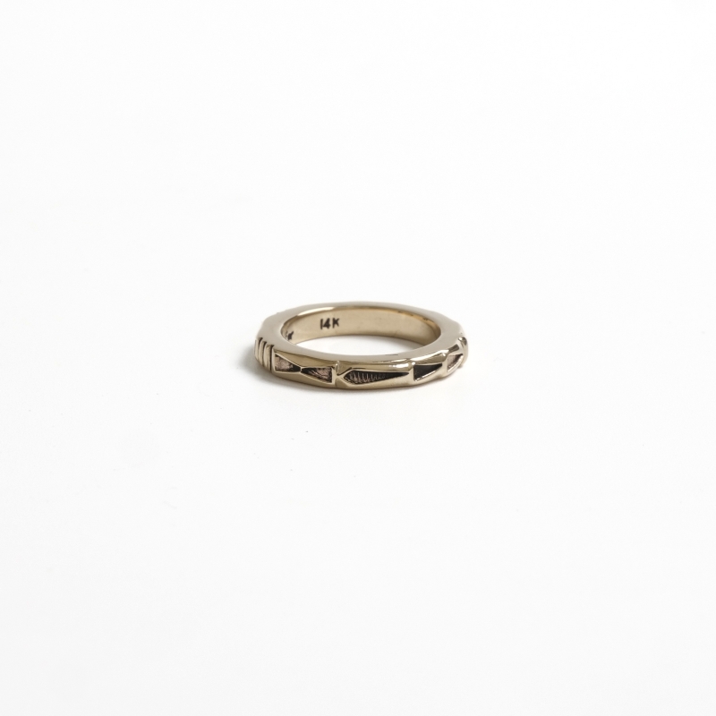 ジェニファーカーティスのスタンプワークリングです。総14金仕立てのスクエアリングは細身ながら肉厚でボリュームがある贅沢仕立て。ジェニファーらしい力強いスタンプワークでカジュアルにゴールドを身につけられ、デイリーユースにも特別なギフトにもオススメ。銀よりも硬い金は非常に扱いが難しく、ジェニファー自身も毎回苦労しながら制作しており、総14金ジュエリーは滅多に入荷することがありません。また金が高騰した現在では金材のコストダウンが進み、この太さの総14金ワイヤー素材自体入手が難しくなっています。貴重なチャンスに是非。