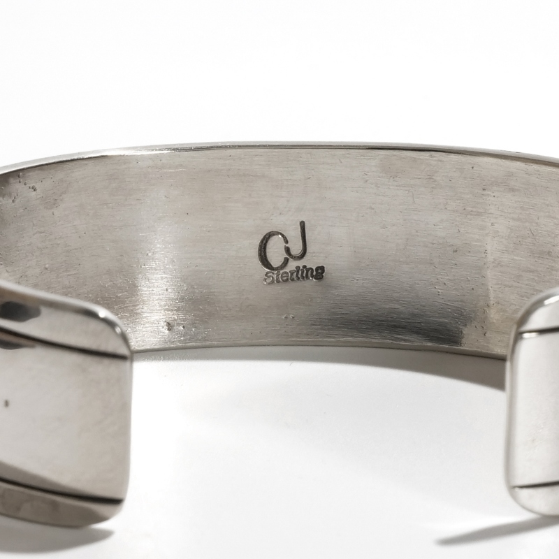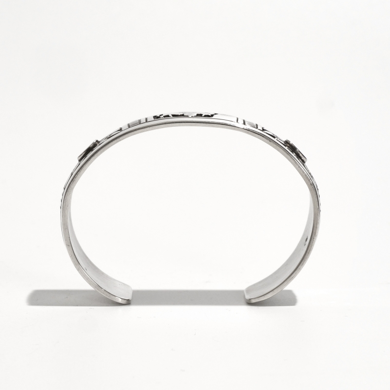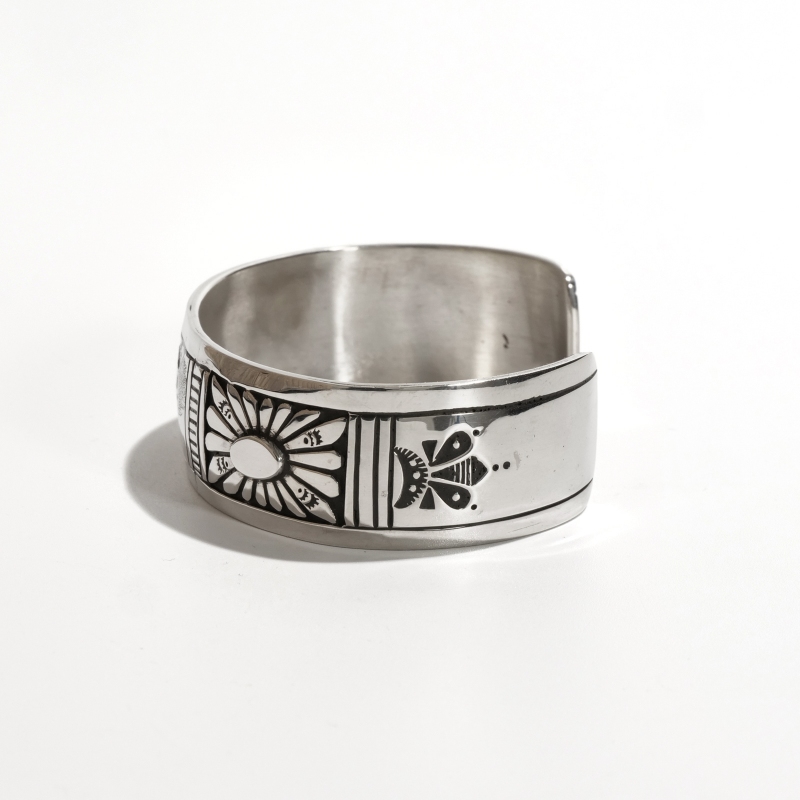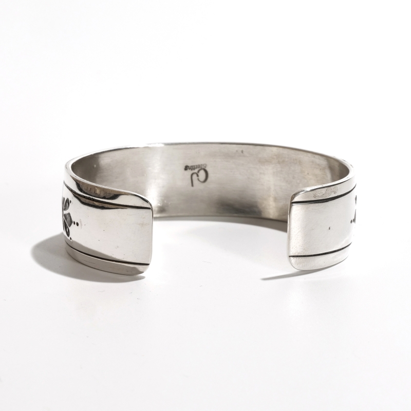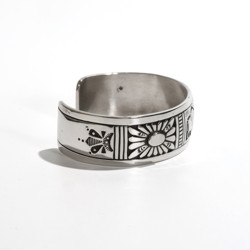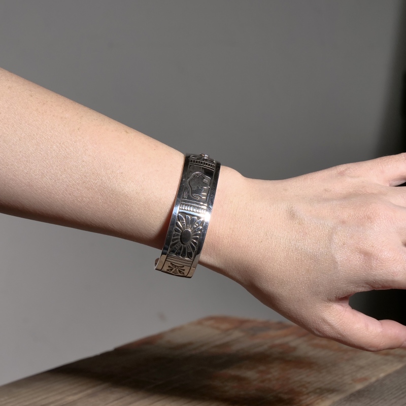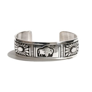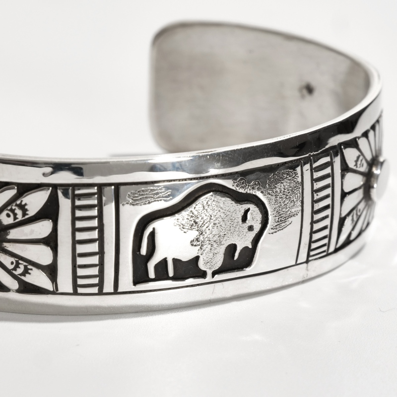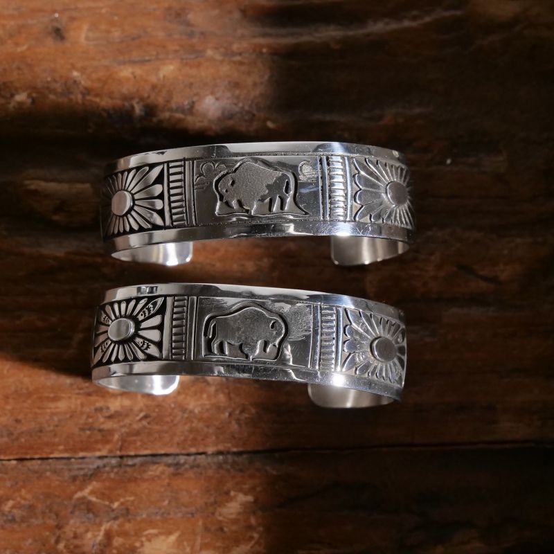 チャーリージョンのオーバーレイバングルです。チャーリージョンらしいナバホオーバーレイとスタンプワークの組み合わせ、程よい厚みの鏡面シルバーのトップにはキュートなバッファローが。シンプルな線でもそのがっしりとした逞しい体躯が表現され、毛並みや遠景の山々も繊細に刻まれています。サイドにはサンバーストコンチョがあしらわれた今では珍しいデザイン。ナバホ族もかつては大平原でバッファローを追っていた戦士の部族、そのルーツを刻んだヒストリックな1点です。