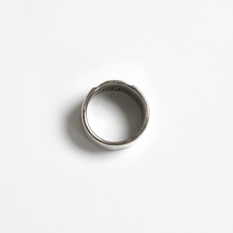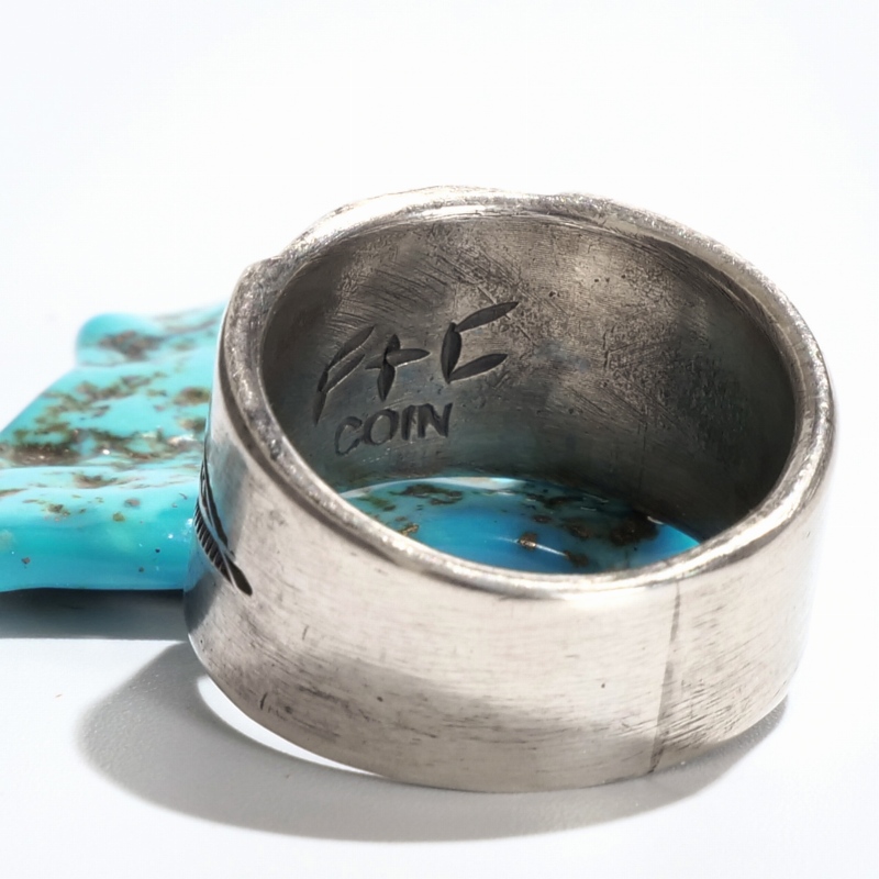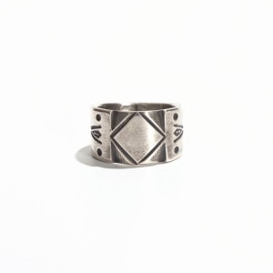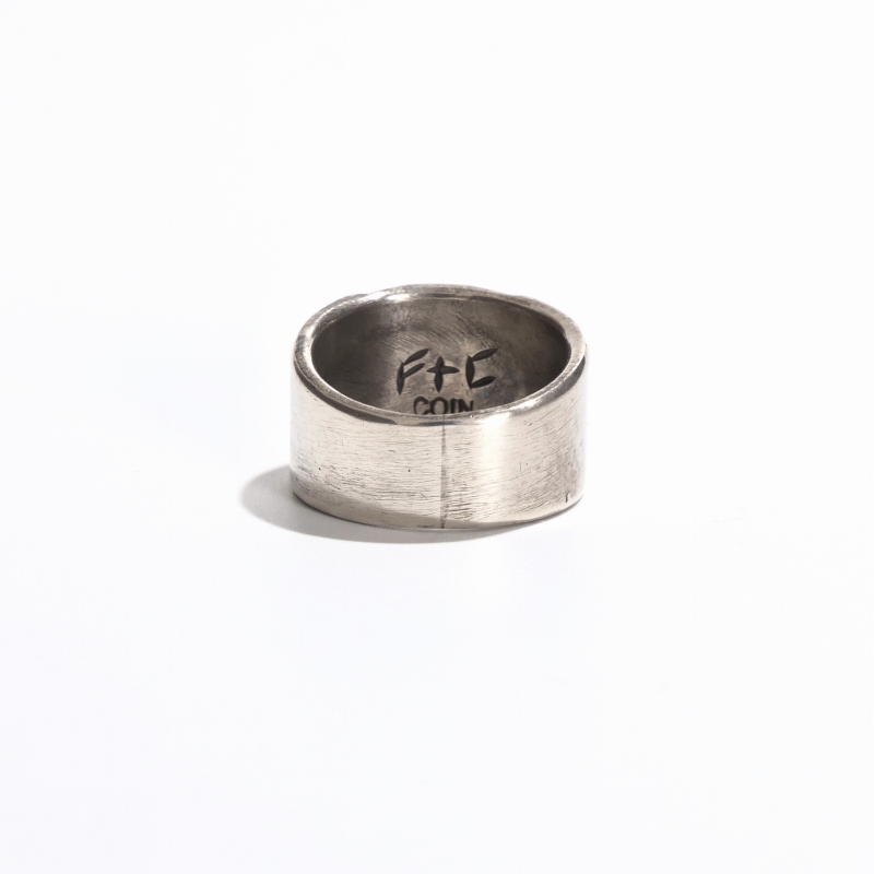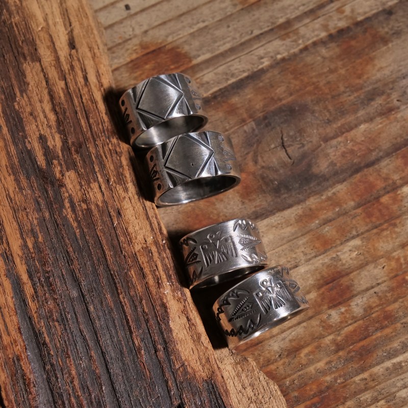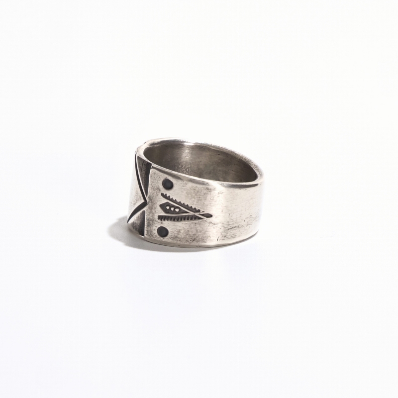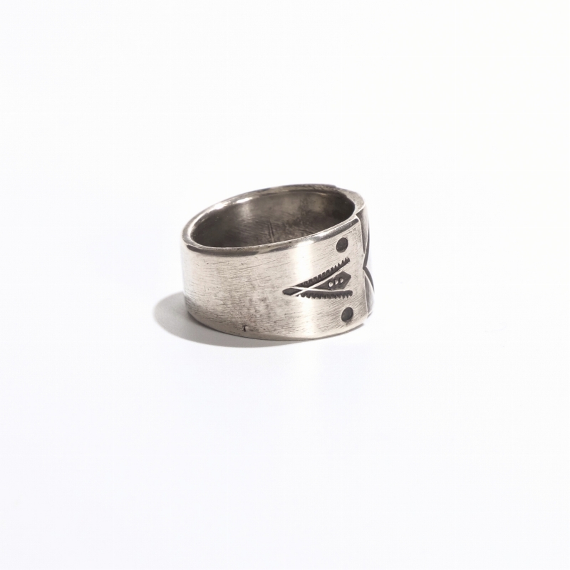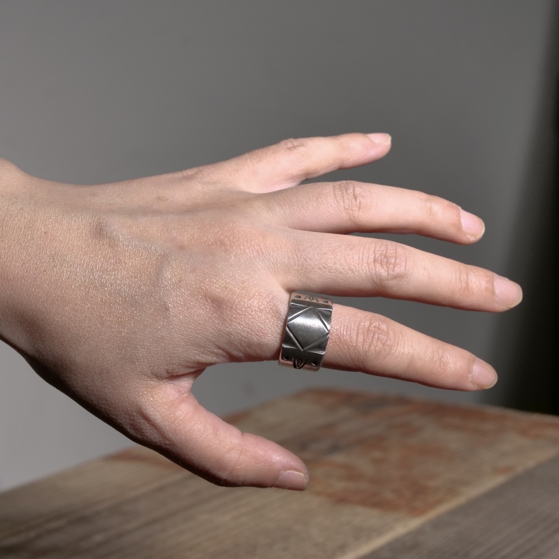 ファルコントレーディングのコインシルバーリングです。通常は90.0インゴットで仕立てるファルコントレーディング作品ですが、このシリーズは銀貨が入荷できたとのことでコインシルバーで製作してもらった特別オーダー品です。ヴィンテージな艶消しの銀肌、中心にはネイティブアメリカンのフォーディレクション(=4つの聖なる方角)を表すダイヤモンド、サイドにクラシックスタンプワークで装飾した1点。幅広ですが驚くほど着け心地滑らか、コインシルバーなので傷がつきにくく、日常使いの良き相棒になれるリング。