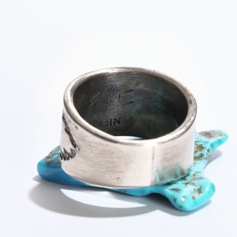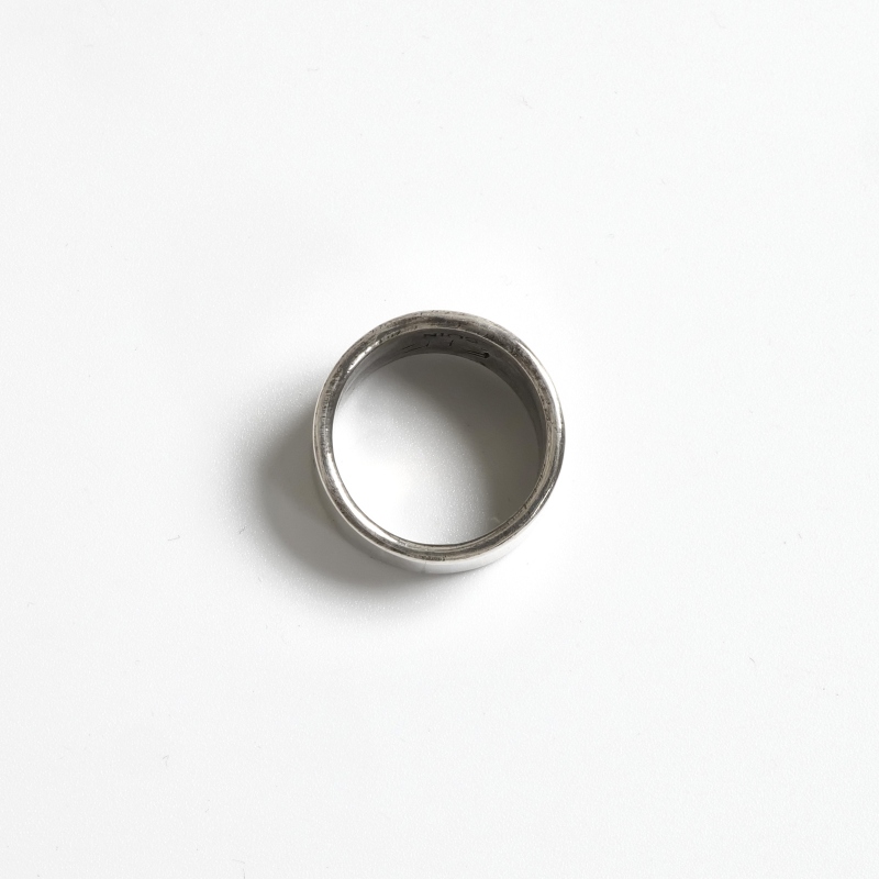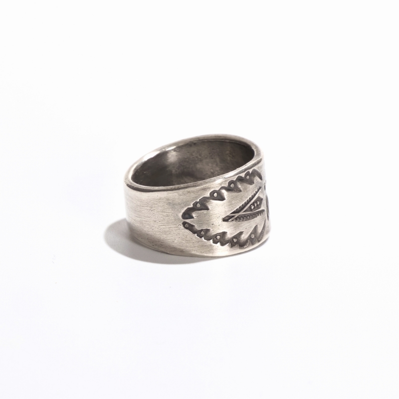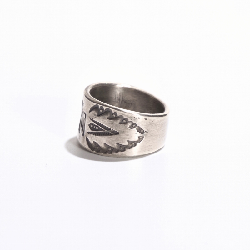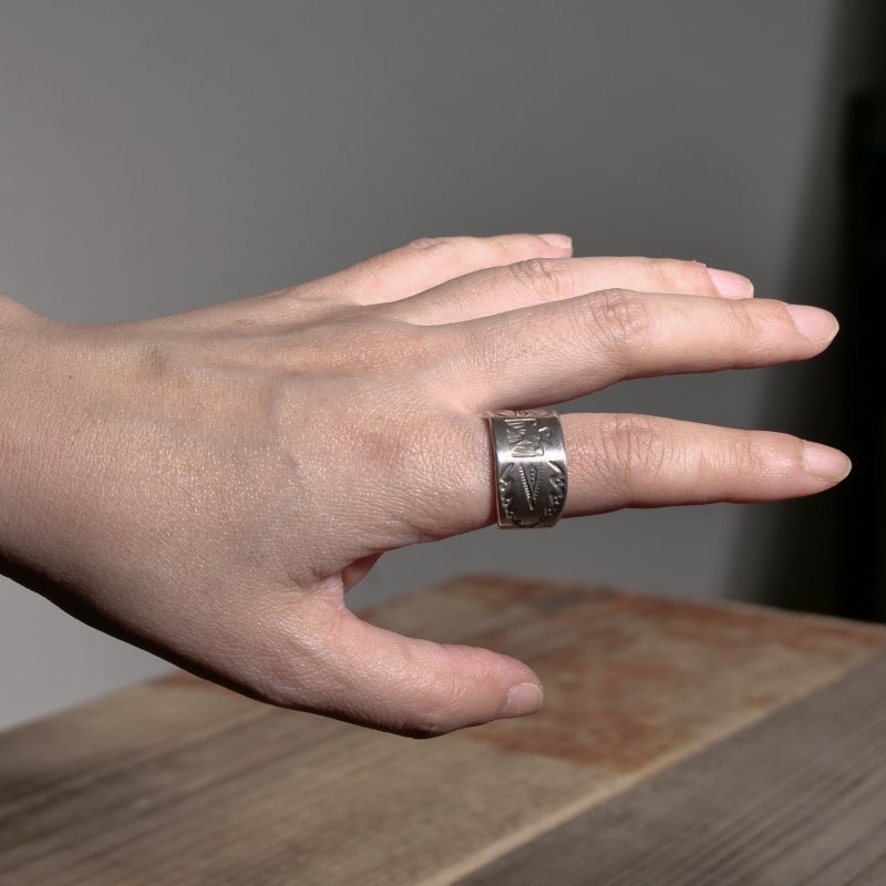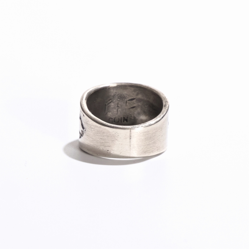 ファルコントレーディングのコインシルバーリングです。通常は90.0インゴットで仕立てるファルコントレーディング作品ですが、このシリーズは銀貨が入荷できたとのことでコインシルバーで製作してもらった特別オーダー品です。ヴィンテージな艶消しの銀肌、中心にはレトロなサンダーバード、サイドはクラシックスタンプで装飾した1点。幅広ですが驚くほど着け心地滑らか、コインシルバーなので傷がつきにくく、日常使いの良き相棒になれるリング。