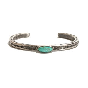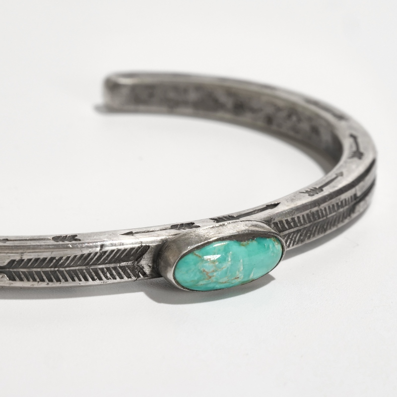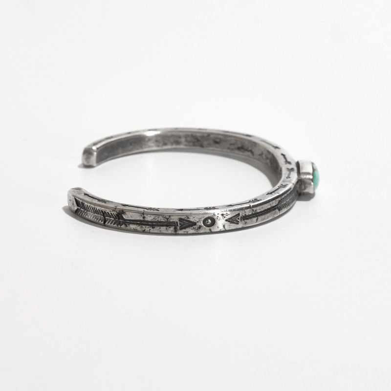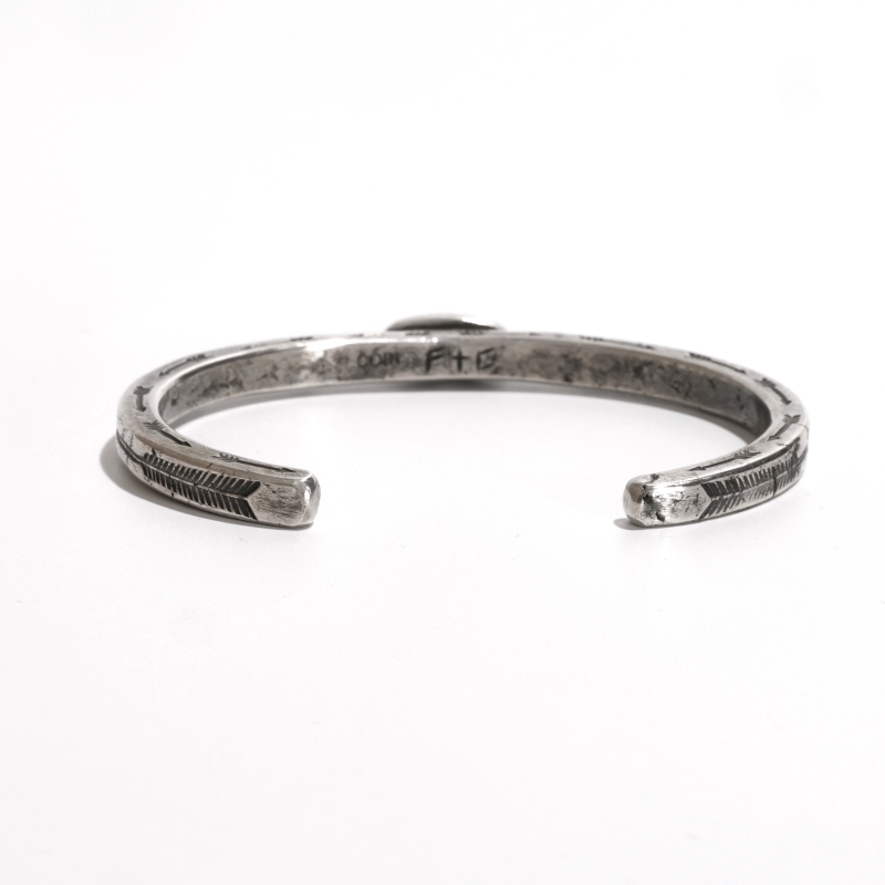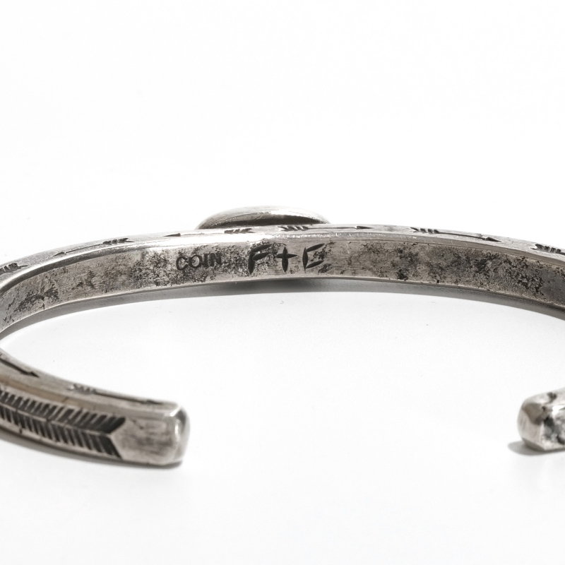 ファルコントレーディングのコインシルバーバングルです。通常は90.0インゴットで仕立てるファルコントレーディング作品ですが、このシリーズは銀貨が入荷できたとのことでコインシルバーで製作してもらった特別オーダー品です。鋳溶かしたコインをヴィンテージな艶消しスクエアタイプに仕立て、中心にはブルーグリーンの艶やかロイストンターコイズ、アームはクラシックなアローの3面スタンプで装飾した1点。武骨な銀肌が本物のヴィンテージのよう。1本でも存在感ありですが重ね付けもおすすめ。