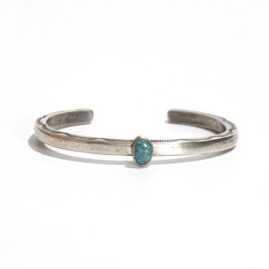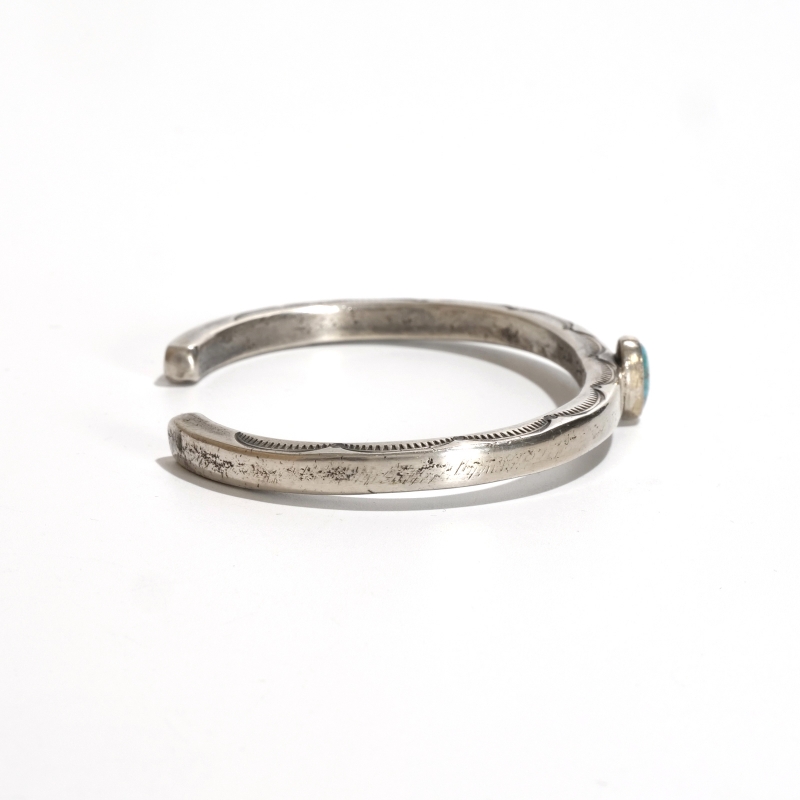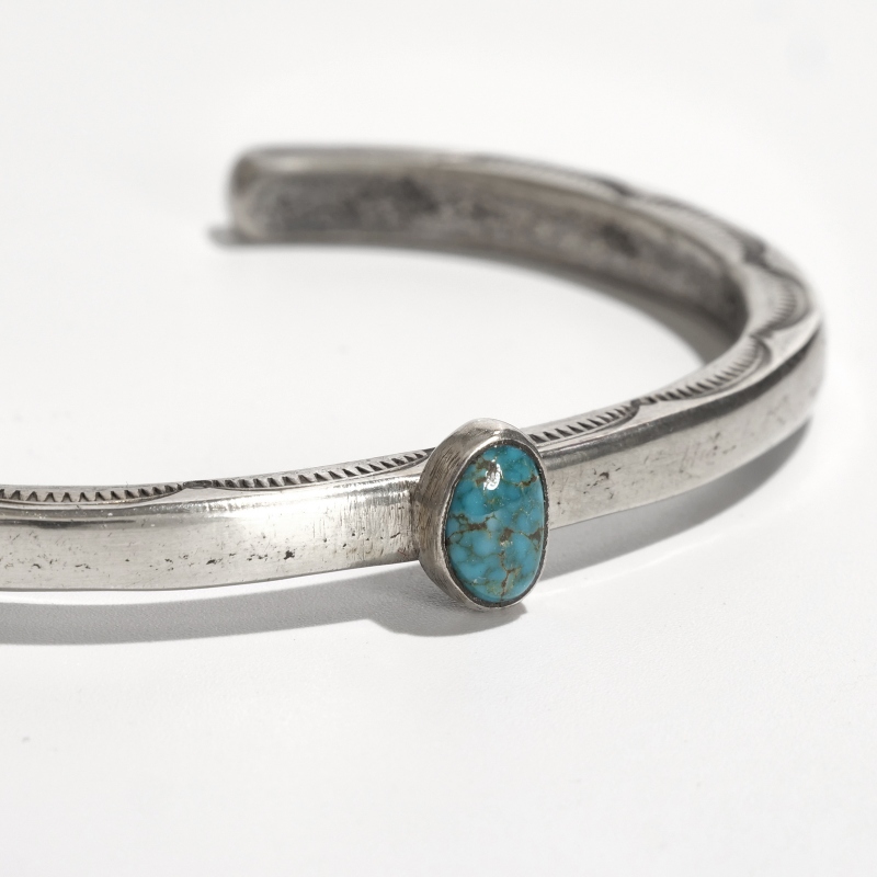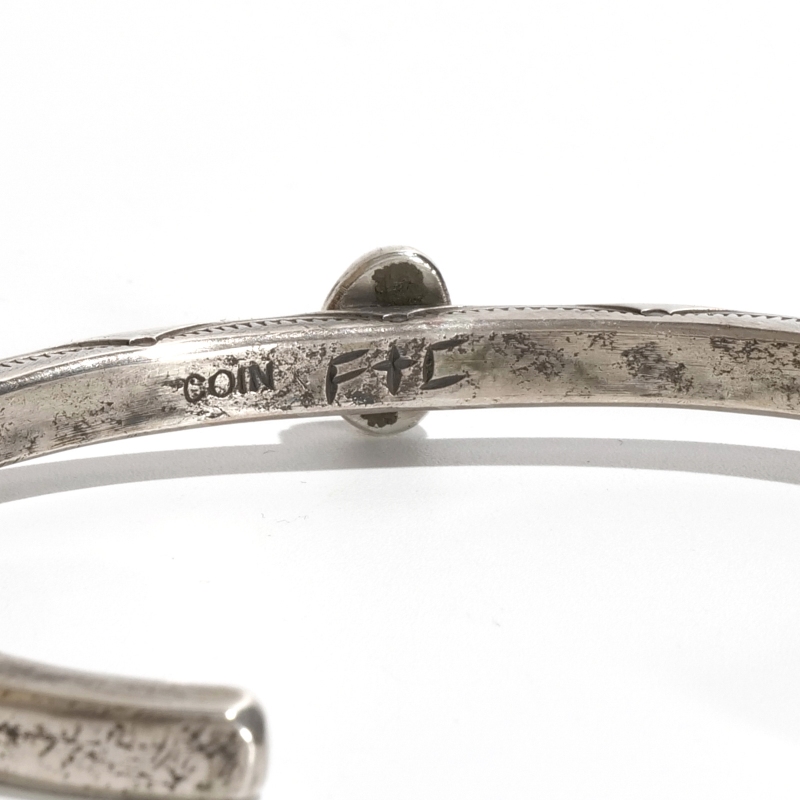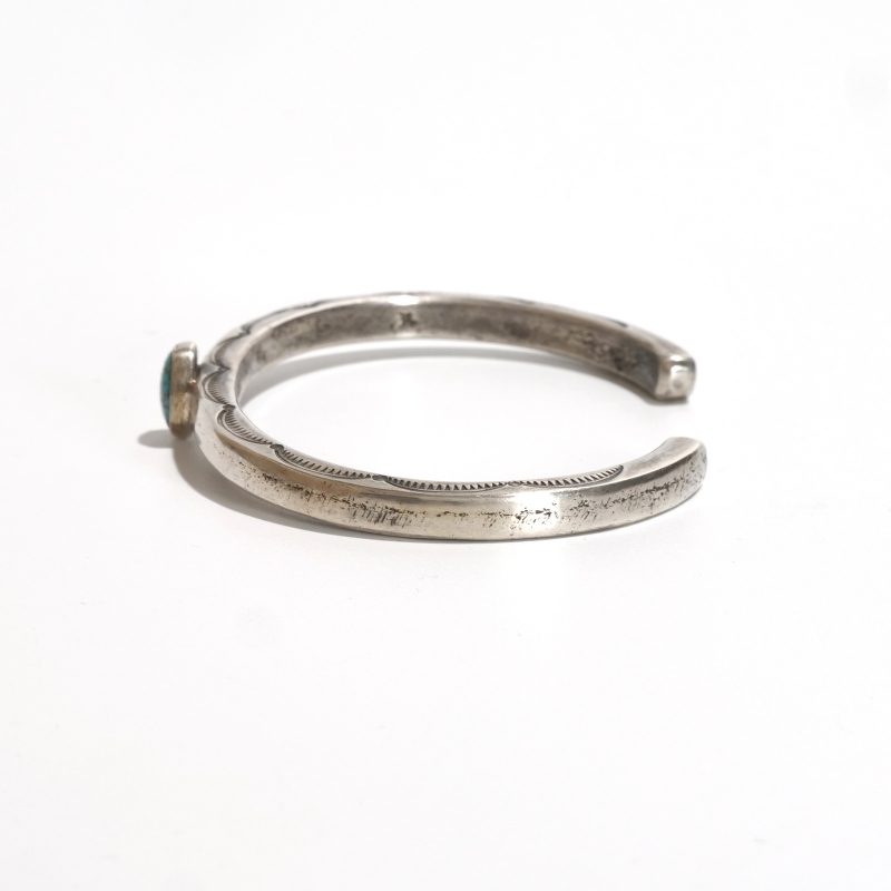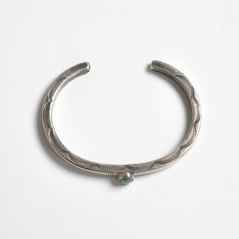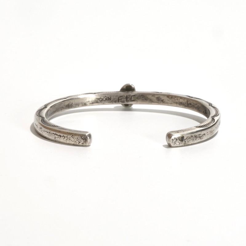 ファルコントレーディングのコインシルバーバングルです。通常は90.0インゴットで仕立てるファルコントレーディング作品ですが、このシリーズは銀貨が入荷できたとのことでコインシルバーで製作してもらった特別オーダー品です。鋳溶かしたコインをヴィンテージな艶消しスクエアタイプに仕立て、中心には小粒でもただならぬ存在感を感じるハイグレードローンマウンテンターコイズ、アームはトップはシンプルな銀面、サイドにのみスタンプ装飾をした粋な1点。武骨な銀肌が本物のヴィンテージのよう、1本でも存在感ありですが重ね付けもおすすめ。