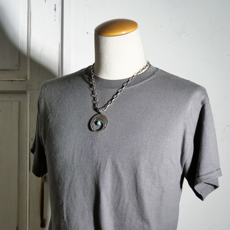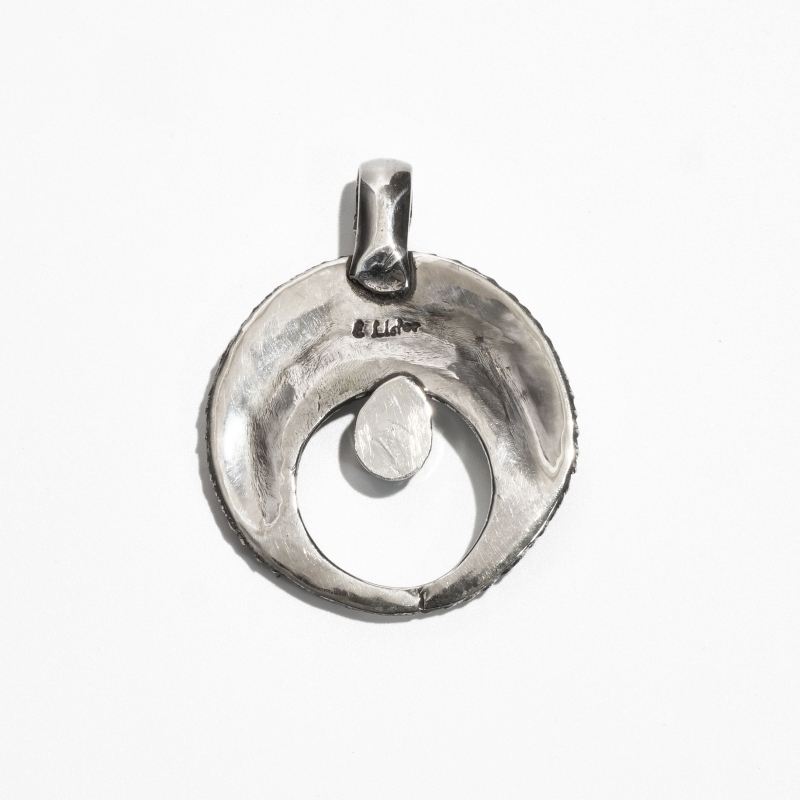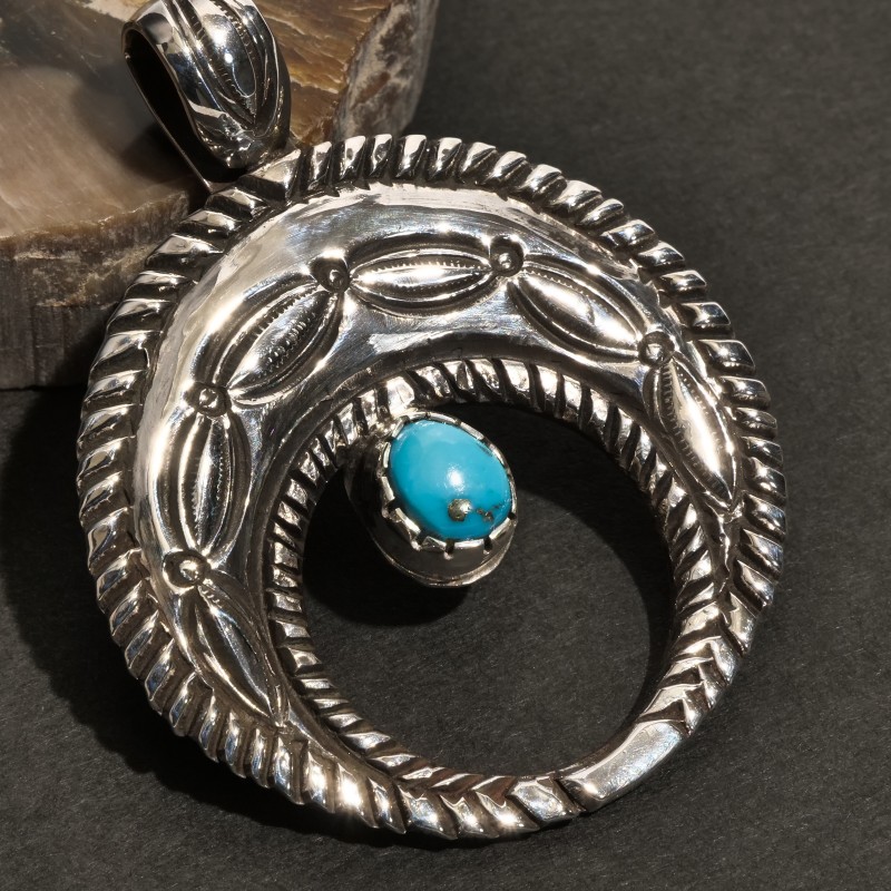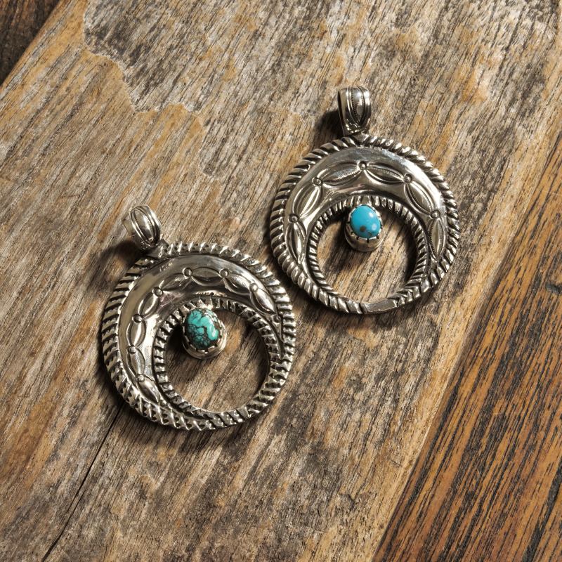 アーニーリスターのコインシルバーペンダントです。古いモルガンダラー銀貨を叩き上げてスタンプワークを配し、ナジャ風に仕立てた作品。美しいブルーの中にパイライトが入ったモレンシをセットしています。バチカンもモルガンダラーのくり抜いた部分を利用した仕立て、エッジや裏にはコインのギザギザが見て取れます。下部のつながったナジャは、その由来である古代の月の女神の三日月紋にも通じ、実に趣深い作品となっています。