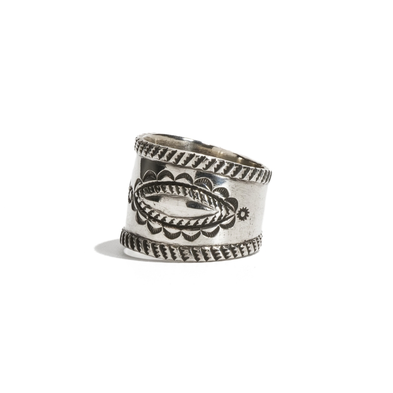 ペリーショーティのスタンプワークリングです。古い銀貨を溶かして作った薄手のコインシルバーをベースに、古いスタンプタガネでクラシックながら個性の立つリングに仕立てています。トップはシンプルなドット、サイドに古いジュエリーに見られるリーフモチーフを配したデザイン。サイドからシャンク部分はテーパーダウンしており着用感もなめらか、格上の存在感ある1点。