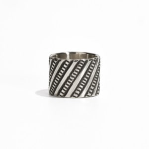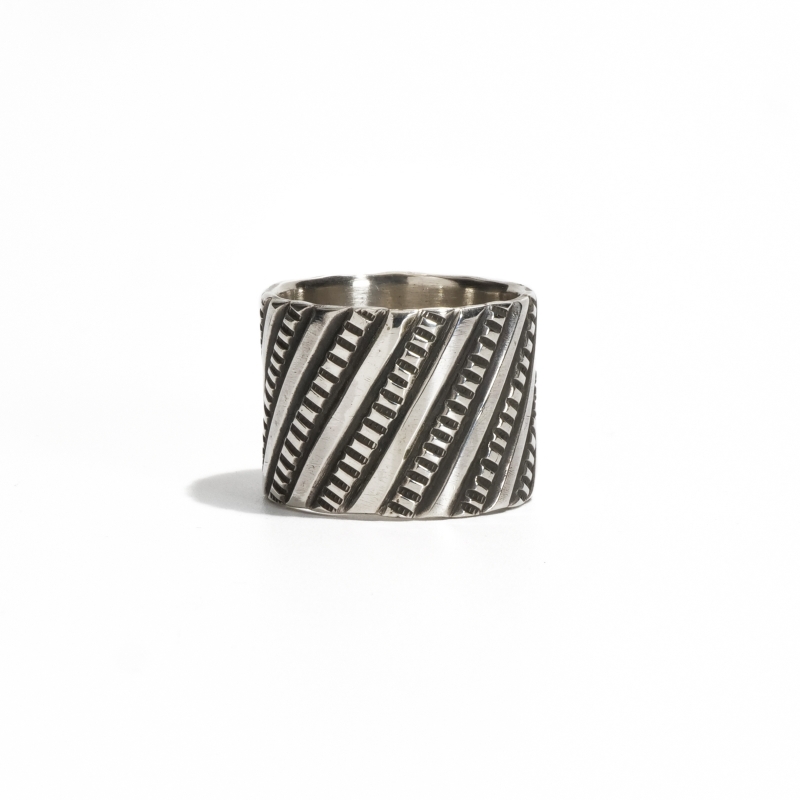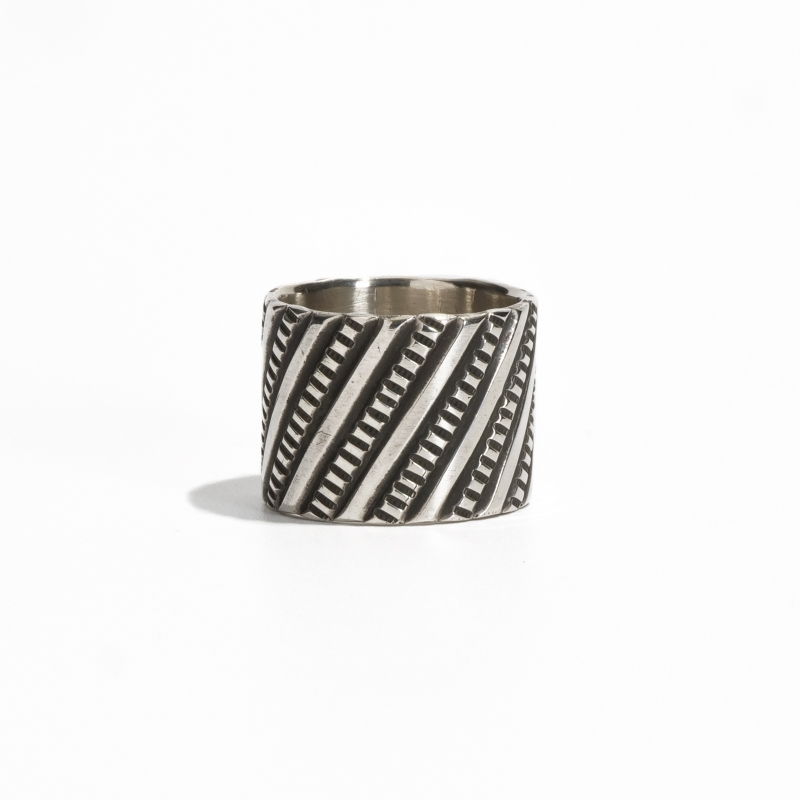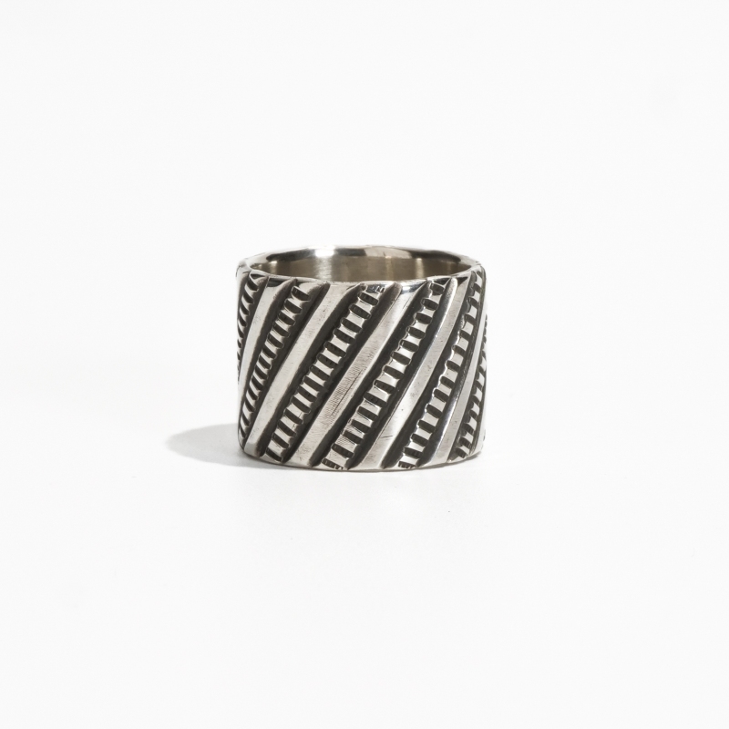 ペリーショーティのチゼルワークリングです。通常は横のラインで打たれることが多いチゼルラインを斜めに配置したコンテンポラリーな作品。このデザインは簡単なようで、リングとして成形する際に折れやすくなるので熟練の技術を要します。この薄さに立体加工、継ぎ目がわからない計算されたチゼル配分と綺麗な溶接、コインシルバーでここまで繊細な造形を完璧に仕上げているのはペリーショーティの経験と技術があってこそ。一見シンプルながら巨匠と呼ばれるに相応しい技を凝縮したリングです。