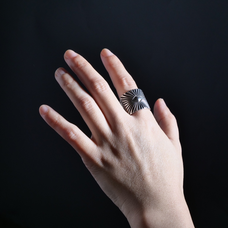 ペリーショーティのスタンプワークリングです。トップにはダイヤモンドバンプアウトを中心としたサンバースト、サイドからバックは細かなスタンプワークで縁取り。この薄さ、コインシルバーでここまで繊細な造形を完璧に仕上げているのはペリーショーティの経験と技術があってこそ。王道デザインながら巨匠と呼ばれるに相応しい技を凝縮したリングです。