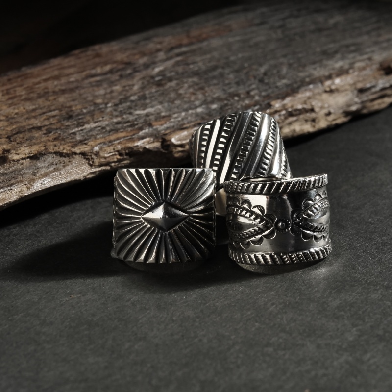 | ご注意 | ※ハンドクラフト特有のゆがみ・ずれ等がある為、表記サイズには多少の誤差がございます。 ※銀は経年で硫化する為、画像より黒ずみが増える、またはより綺麗に磨かれてのお届けとなる場合がございます。 ※インディアンジュエリーは伝統的な手仕事による製法上キズ・銀面のムラ・接合のラフさなどが多く見られるジュエリーです。味わいのうちとしてお楽しみください。 |