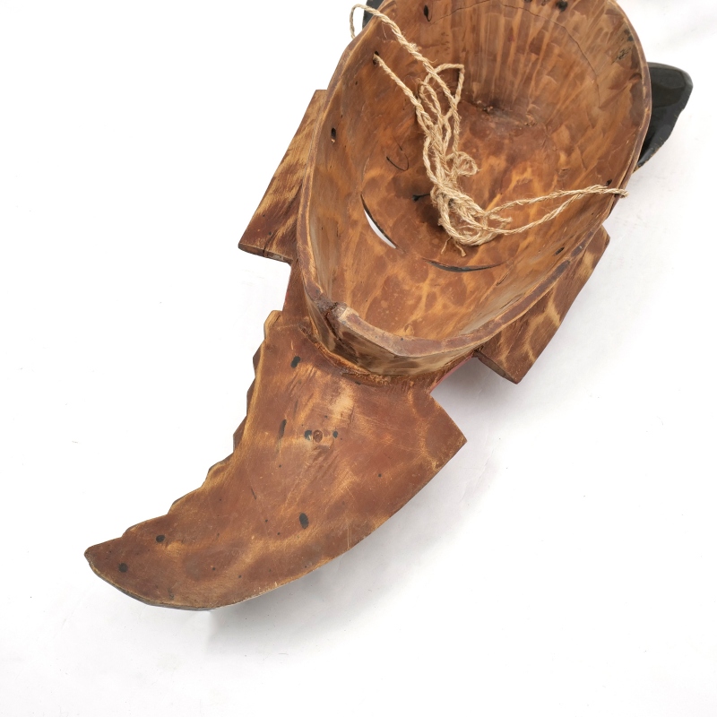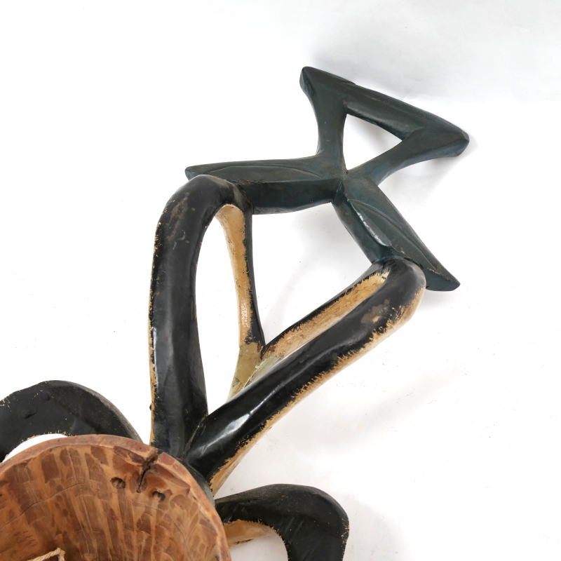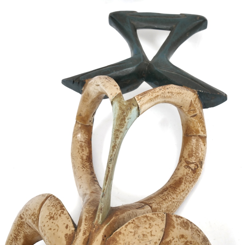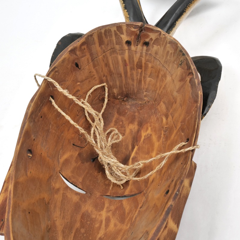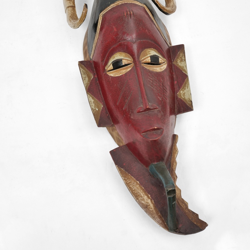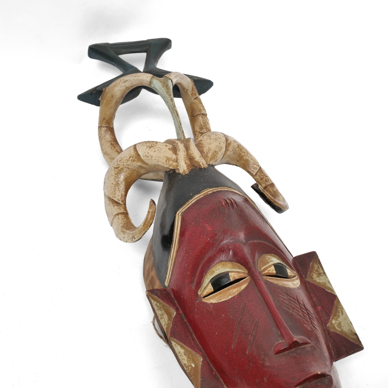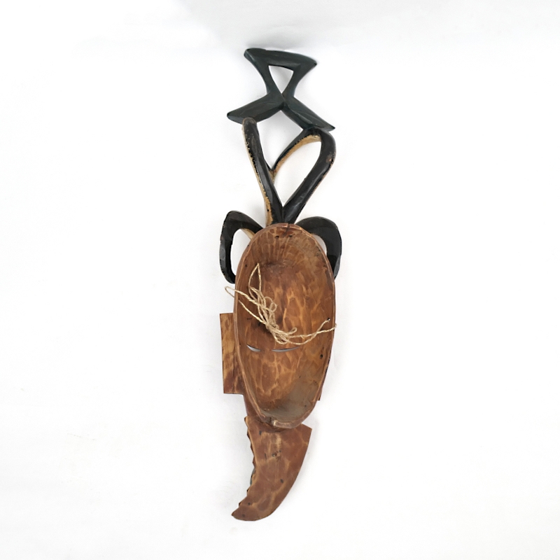 コートジボワールのグロ族による、美しく手彫りされ彩色された伝統的な仮面です。頭上には、精神的な力を象徴する角と、その上に向かい合う鳥をモチーフにした装飾が施されています。これらの仮面は、葬儀や結婚の儀式、祭りの舞踏など、さまざまな伝統行事で用いられ、祖先や超自然的存在、神話上の「グー(Gu)」を象徴しているといわれます。落ち着きと神秘的な雰囲気を感じさせる佇まいは、アフリカンアートとしてお部屋に飾るだけでも空間に深みと個性をプラス。