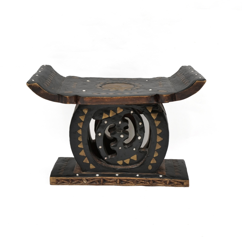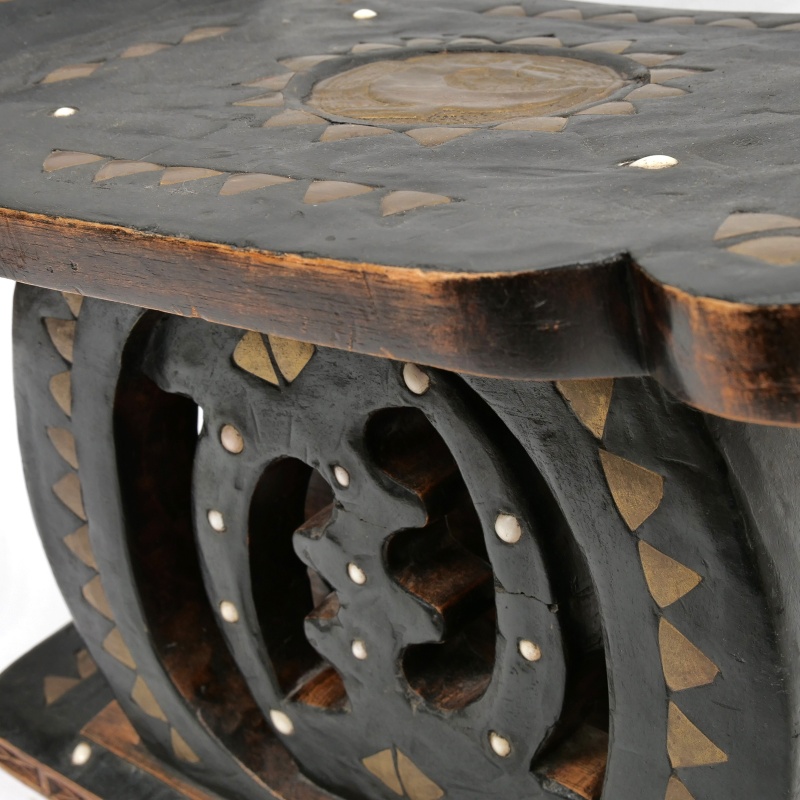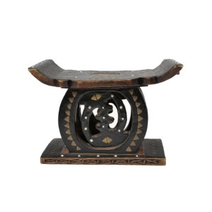 大きな丸太をそのまま一刀彫りでくり抜いて作られたアシャンテ族のウッドスツール。様々なデザインがありますが、スツールの座面の両端が上に反りかえっている事やアカン文化の一つであるアディンクラシンボルと呼ばれる独特のシンボルが中心に装飾として入れられているのが特徴的。このスツールにあしらわれているものははNyame Ye Ohene(ニャメ・イェ・オヘネ)とよばれるアディンクラシンボルと思われる。意味は「神は王である」で、神が宇宙の究極の支配者であり、比類なき権威と至高の存在であることを表す「神の王権」と「神の至上性」の象徴とされる。?インパクトのある小物置きやオブジェや家具としてご自宅や店舗のインテリアに取り入れてみてはいかがでしょうか。