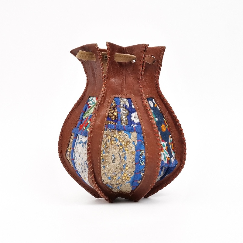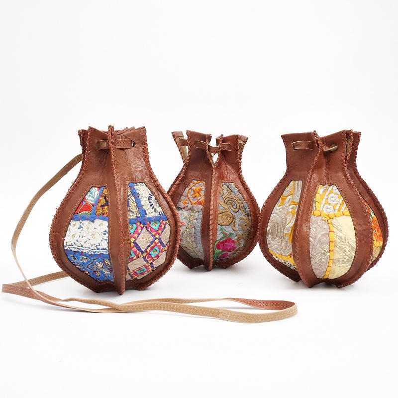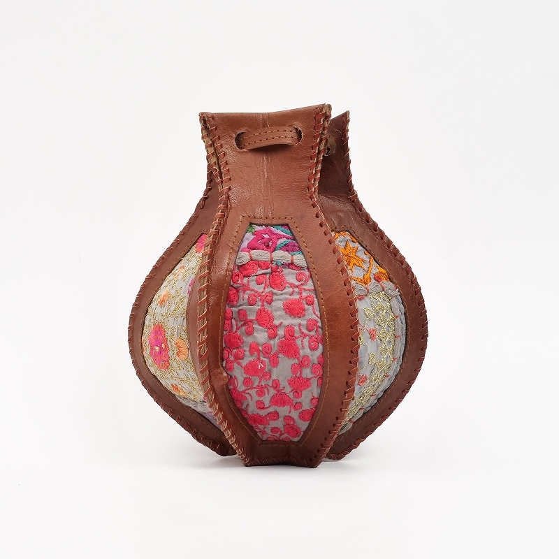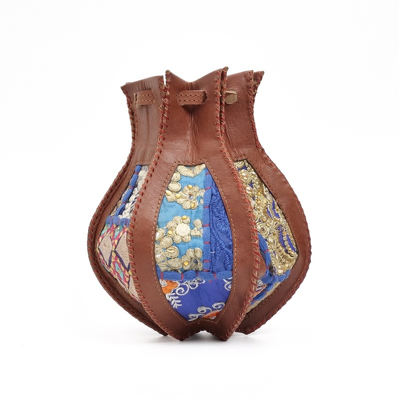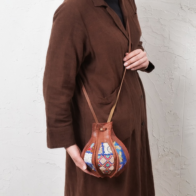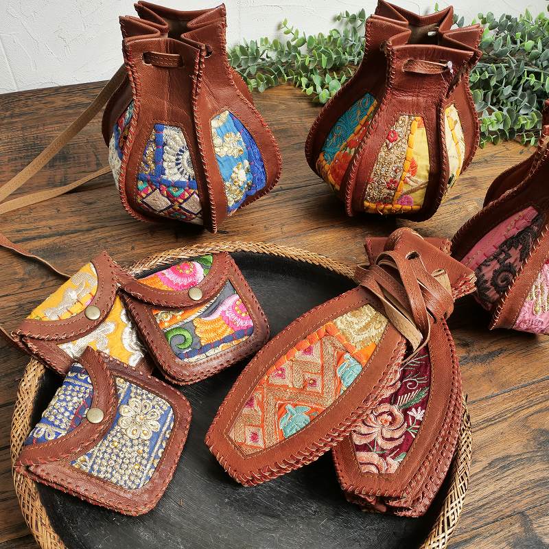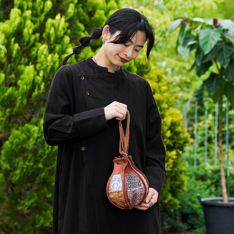 ジョドプールの山羊革とカンバディアを組み合わせたバッグ。広げるとコロンとしたユニークなシルエットのピッチャーバッグで、中身を出し入れしやすいようにくびれ部分までスリットを入れました。平たく折りたたんで収納できるのもポイント。スマートフォンやハンカチなどを入れることができ、ワンショルダーで肩掛けにもできます。なめした山羊革を裁断するところから縫い合わせまで手作業で行われています。カンバディアは基本的に全て手刺繍で作られたオールドドレスのパッチワーク生地ですべて1点もの。(一部ミシン刺繍生地の場合もあります。)コーディネートのアクセントになるアイテム。