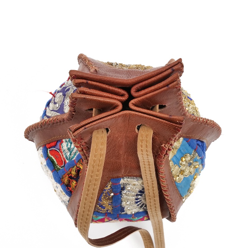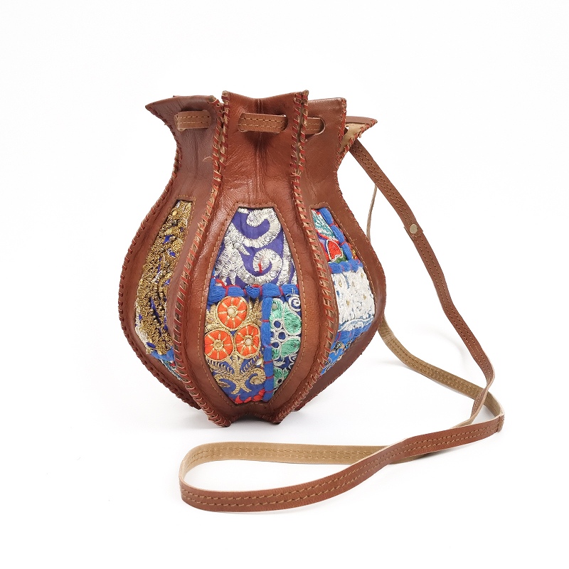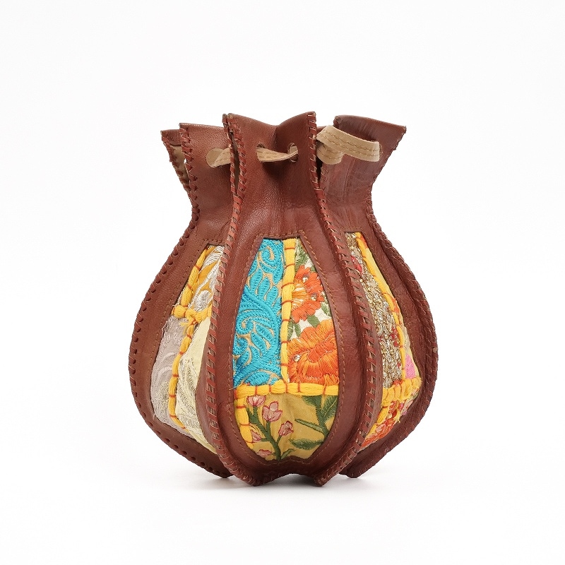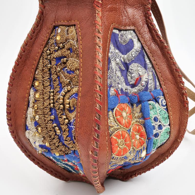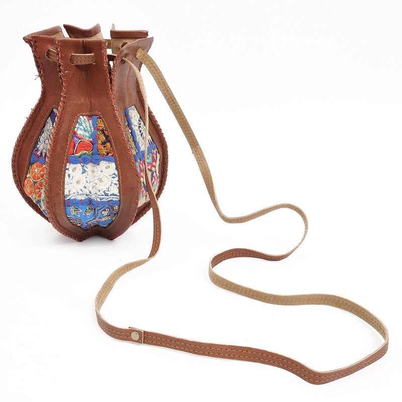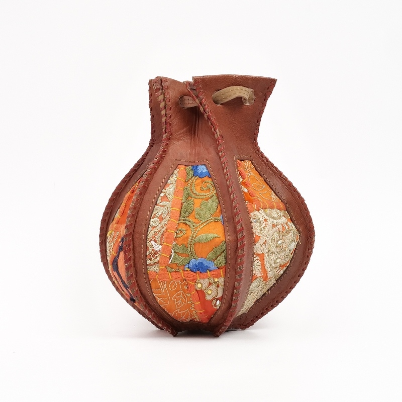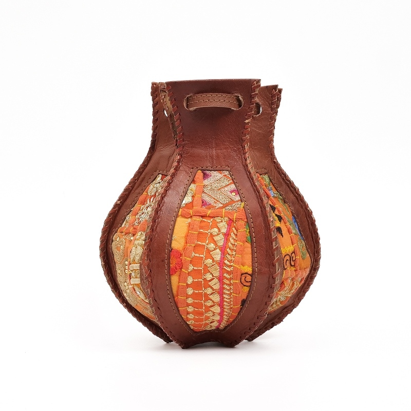 ジョドプールの山羊革とカンバディアを組み合わせたバッグ。広げるとコロンとしたユニークなシルエットのピッチャーバッグで、中身を出し入れしやすいようにくびれ部分までスリットを入れました。平たく折りたたんで収納できるのもポイント。スマートフォンやハンカチなどを入れることができ、ワンショルダーで肩掛けにもできます。なめした山羊革を裁断するところから縫い合わせまで手作業で行われています。カンバディアは基本的に全て手刺繍で作られたオールドドレスのパッチワーク生地ですべて1点もの。(一部ミシン刺繍生地の場合もあります。)コーディネートのアクセントになるアイテム。