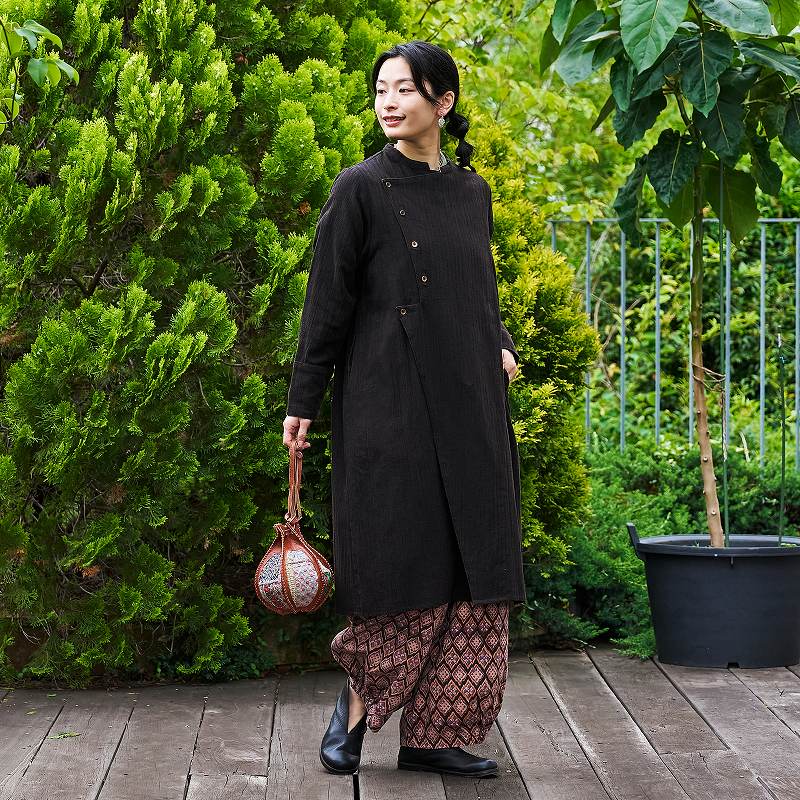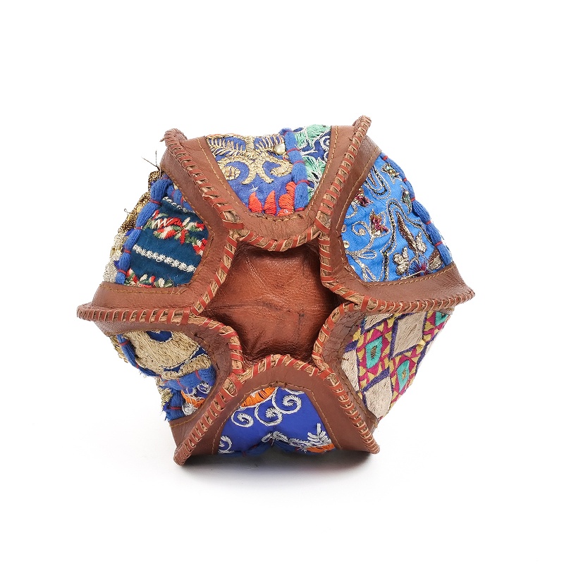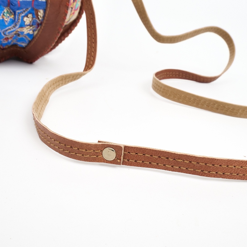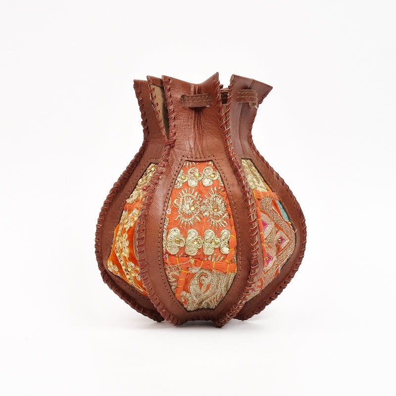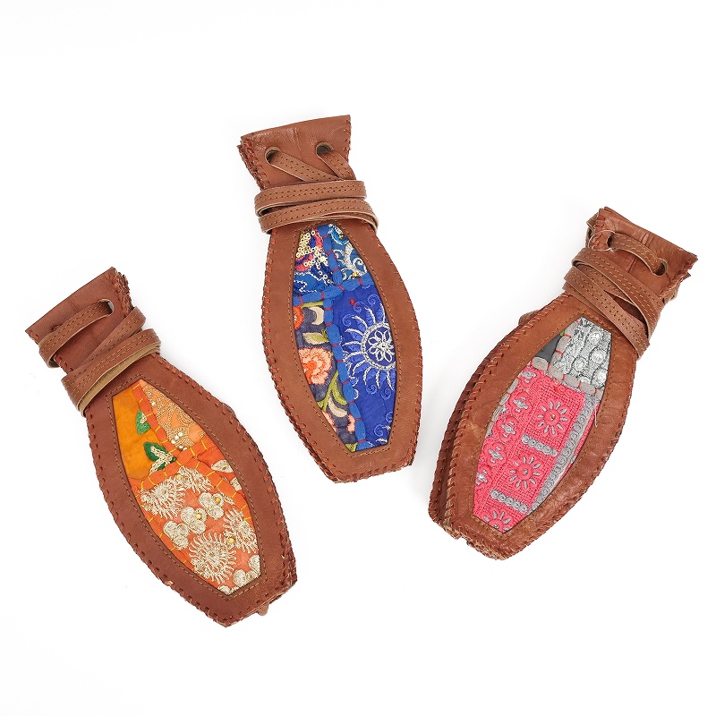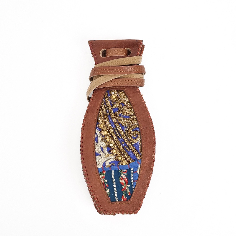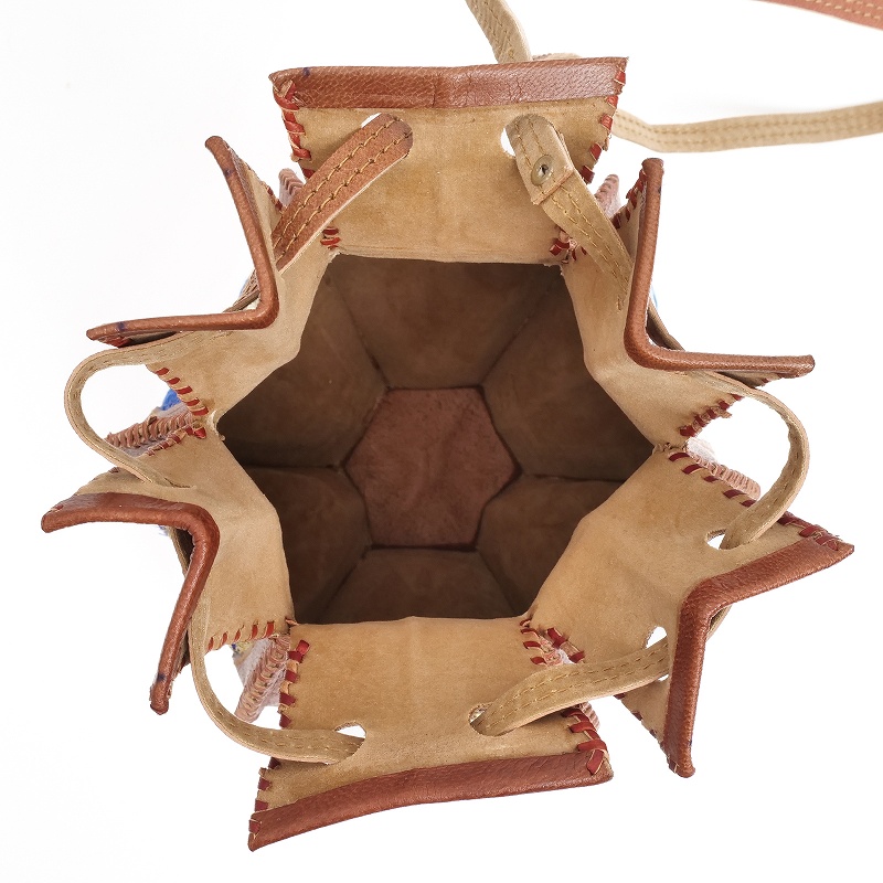 ジョドプールの山羊革とカンバディアを組み合わせたバッグ。広げるとコロンとしたユニークなシルエットのピッチャーバッグで、中身を出し入れしやすいようにくびれ部分までスリットを入れました。平たく折りたたんで収納できるのもポイント。スマートフォンやハンカチなどを入れることができ、ワンショルダーで肩掛けにもできます。なめした山羊革を裁断するところから縫い合わせまで手作業で行われています。カンバディアは基本的に全て手刺繍で作られたオールドドレスのパッチワーク生地ですべて1点もの。(一部ミシン刺繍生地の場合もあります。)コーディネートのアクセントになるアイテム。