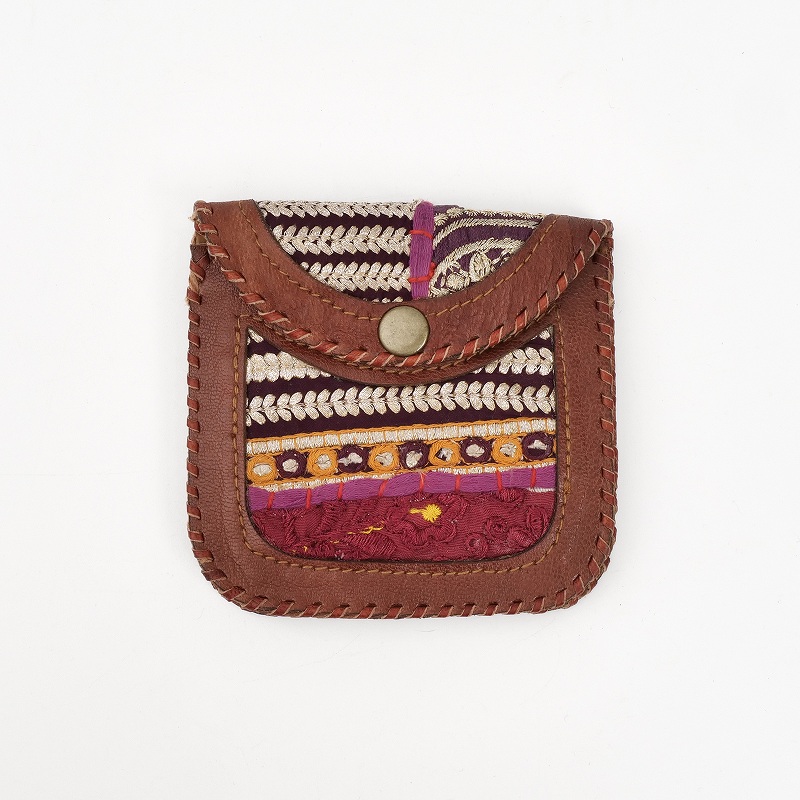 ジョドプールの山羊革アイテムとカンバディアを組み合わせたカードサイズのミニポーチ。ジョドプールの山羊革小物は、なめした山羊革やラクダ革を裁断するところから縫い合わせたり刺繍を施すところまで手作業で行われています。カンバディアはたまにミシン刺繍の生地が混ざっていることもありますが、基本的に全て手刺繍で作られたオールドドレスのパッチワークです。