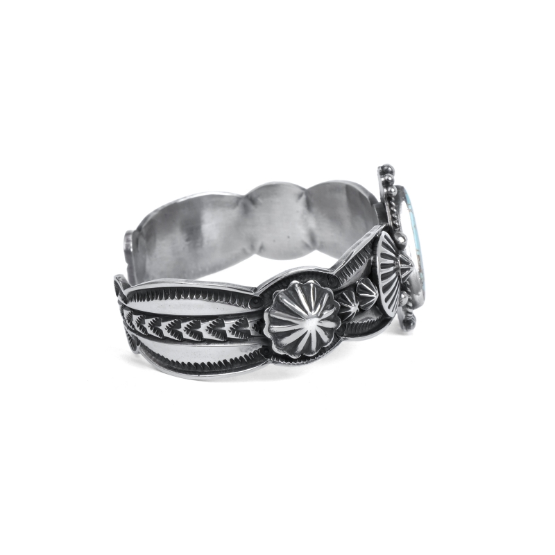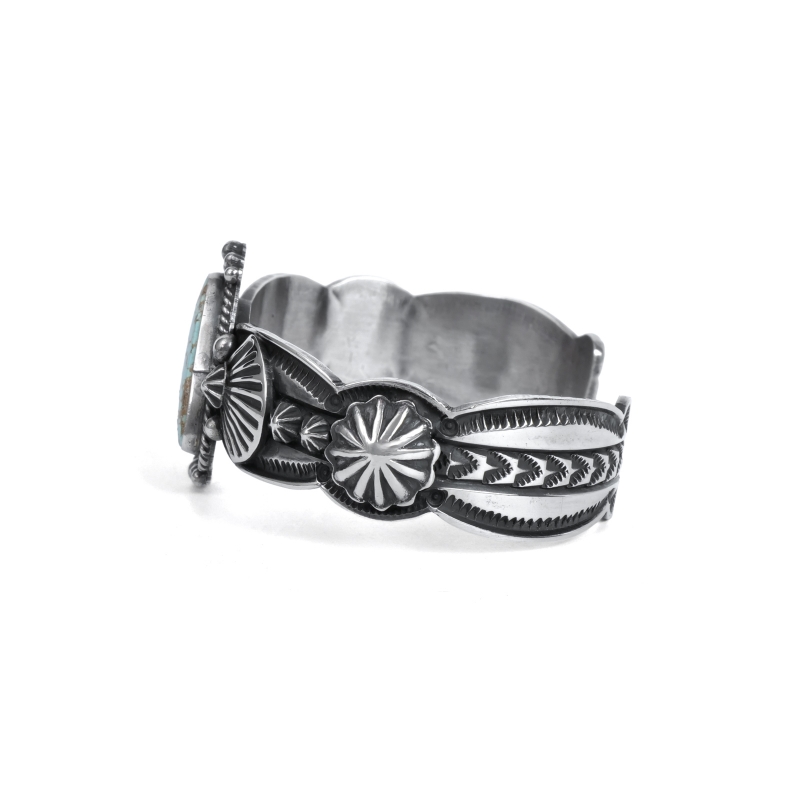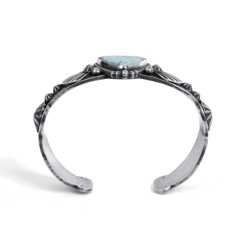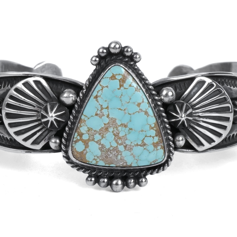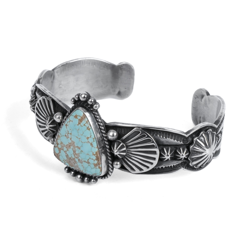 ドノヴァンキャドマンのターコイズバングルです。トップには珍しいトライアングルシェイプのナンバーエイトターコイズ。艶やかな水色に走るゴールドベージュのマトリックスとウェブがナンバーエイトらしい良い風景の石です。アームは細身ですが、カットアウトされたエッジとひとつひとつスタンプされたアップリケパーツが存在感を主張、石の周囲はドロップで飾られています。クラシックでドレッシー、サウスウエストらしいタフさもある絶妙なバランスの1点。ドノヴァンの生前に入手していた、マライカストアコレクションからの厳選品です。