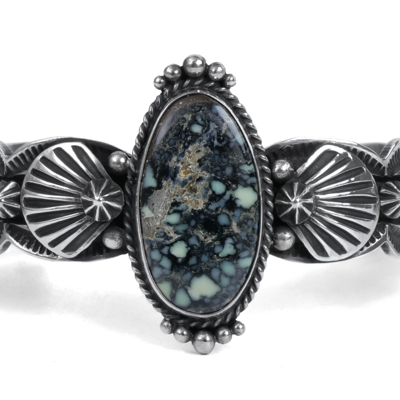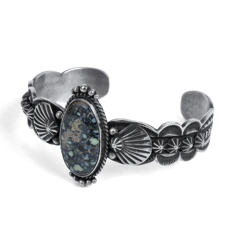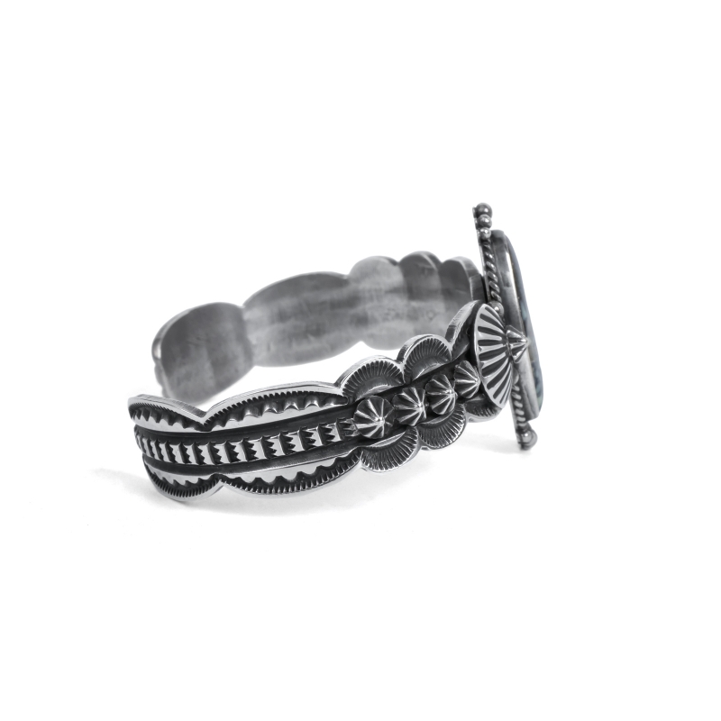 ドノヴァンキャドマンのターコイズバングルです。トップにはオリーブイエローに漆黒のウェブ、ゴールドベージュのマトリックスが入り混じる渋いニューランダーターコイズ。アームは細身ですが、カットアウトされたエッジとひとつひとつスタンプされたアップリケパーツが存在感を主張、石の周囲はドロップで飾られています。クラシックでドレッシー、サウスウエストらしいタフさもある絶妙なバランスの1点。ドノヴァンの生前に入手していた、マライカストアコレクションからの厳選品です。
