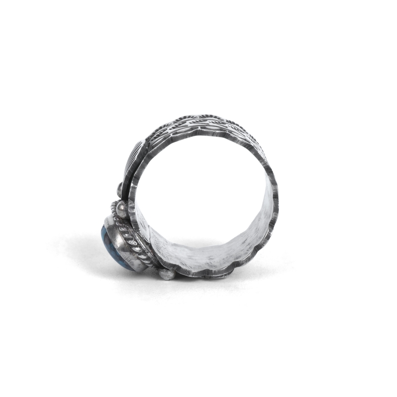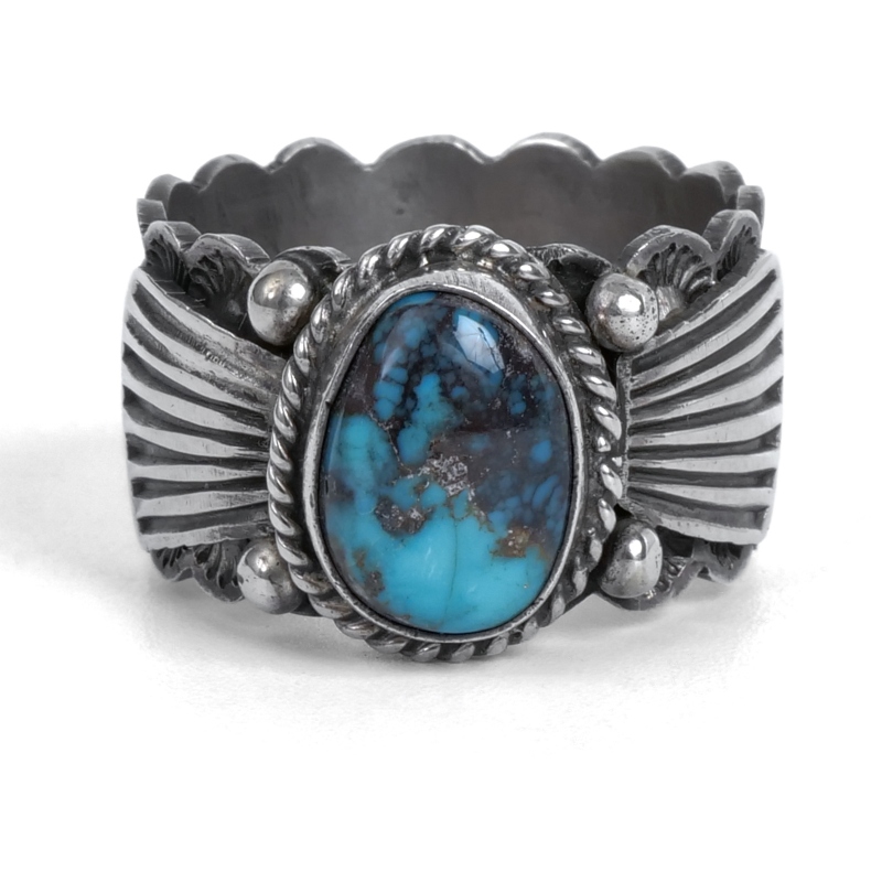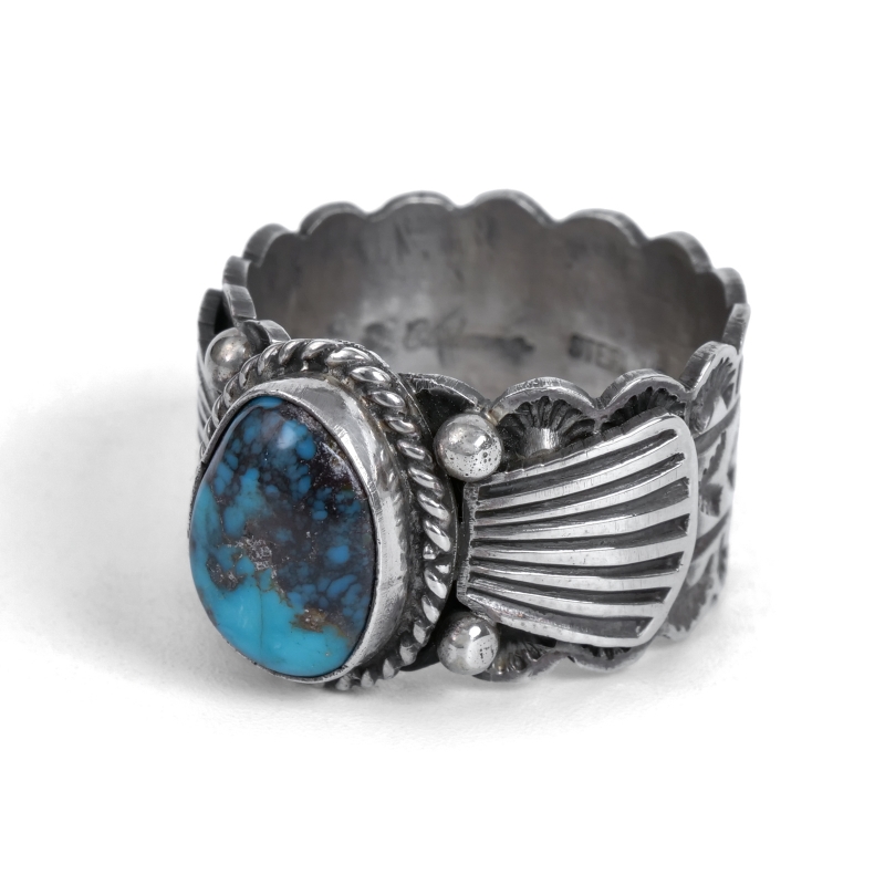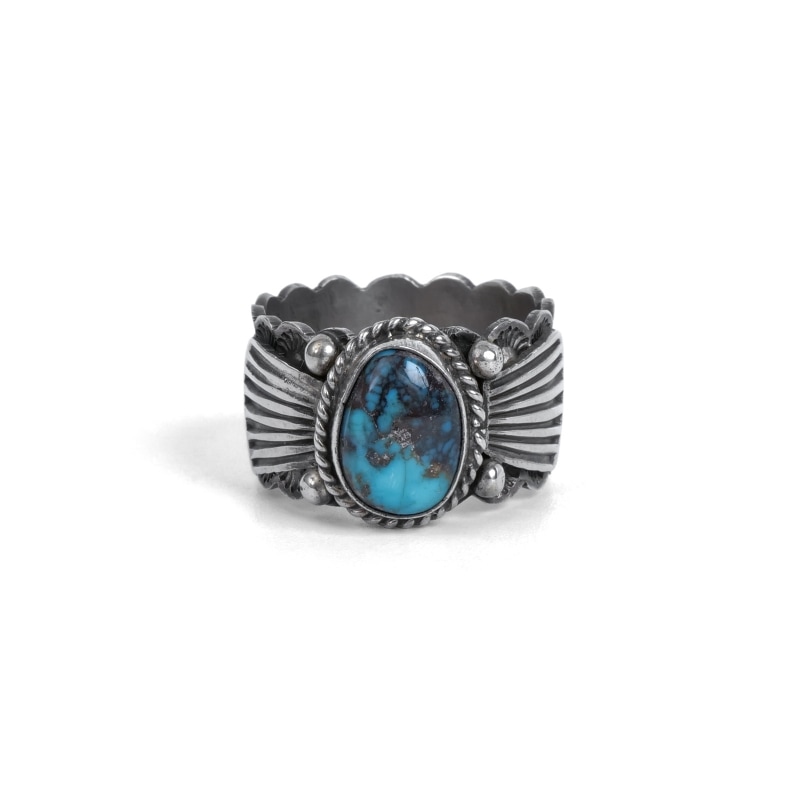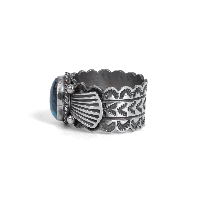 ドノヴァンキャドマンのターコイズリングです。インディアンジュエリーの定番スタイル、こちらは小粒ながらハイグレード、鮮やかなビズビーターコイズをあしらった程よい幅の1点。シャンクはスタンプに合わせエッジをカットアウトしクラシックに、リングの継ぎ目を石裏に配することで丁寧なスタンプが途切れずつながる仕立てです。ドノヴァンの生前に入手していた、マライカストアコレクションからの厳選品です。