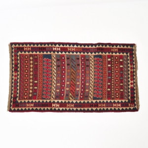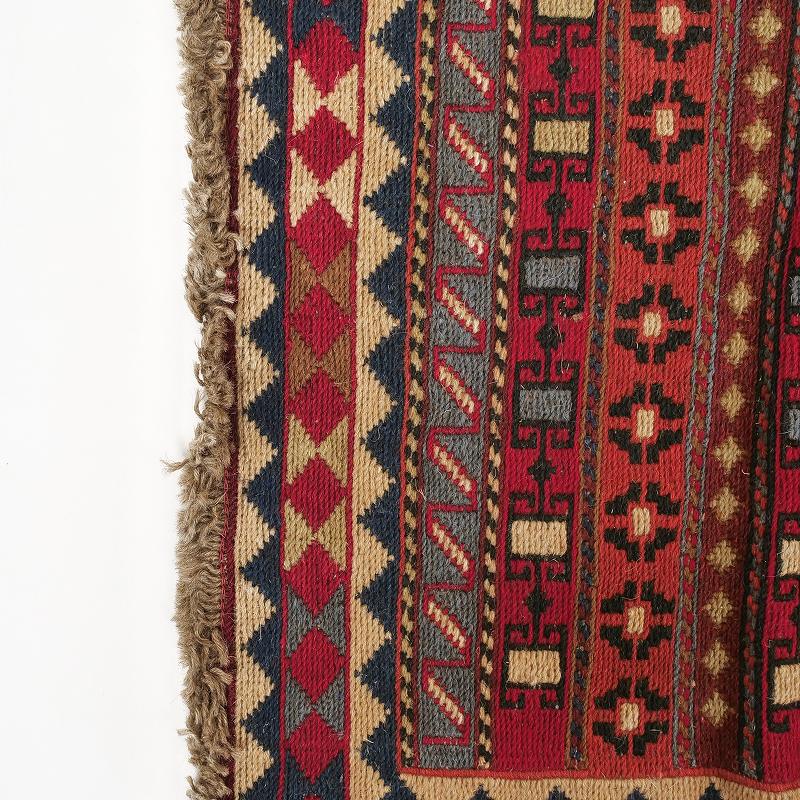 2005~2010年あたりに織られたオールドキリム。小さめのサイズでインテリアに取り入れやすい。キリムは日常使いの大柄なものから、族長に献じられた繊細な柄まで、モチーフにひとつひとつ意味を込め、織り上げられる実用とアートを兼ねた工芸品です。季節やシーンに合わせて飾れば、華やかでエキゾチックなアクセントに。