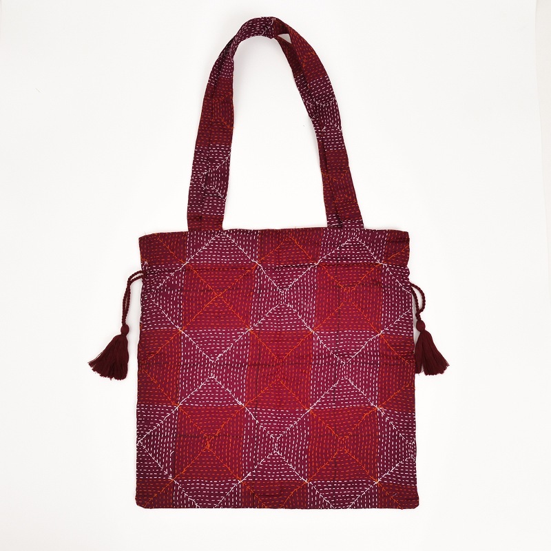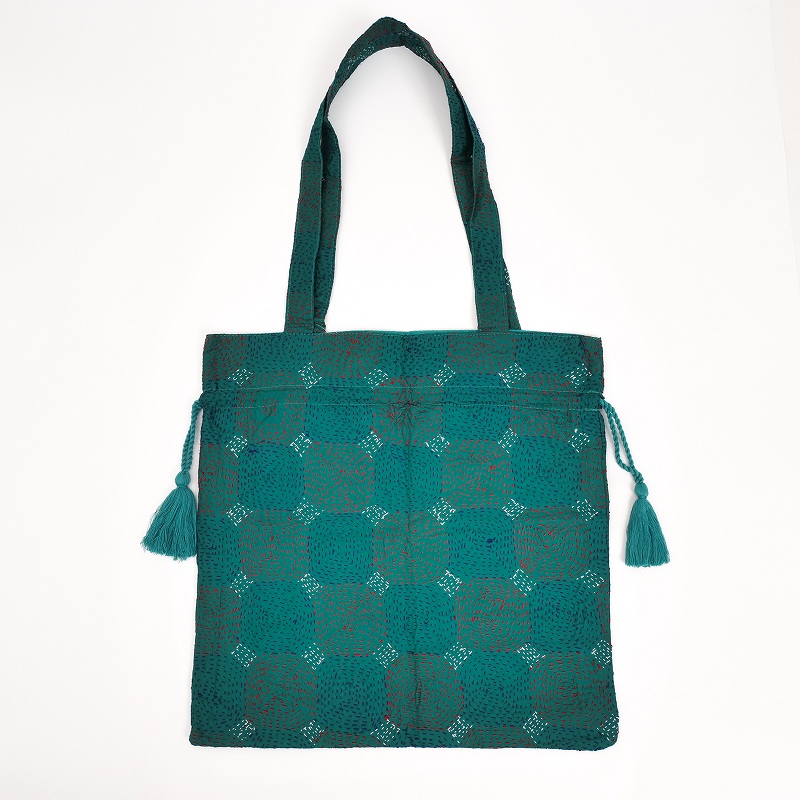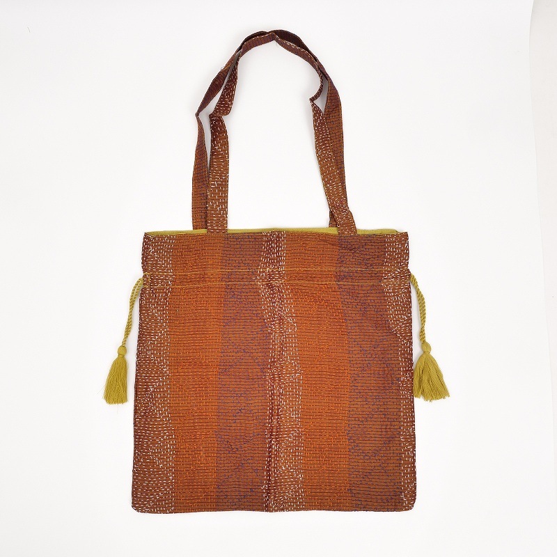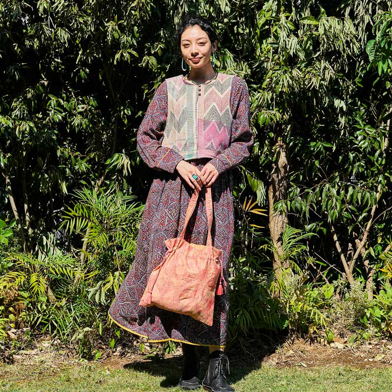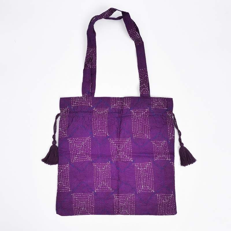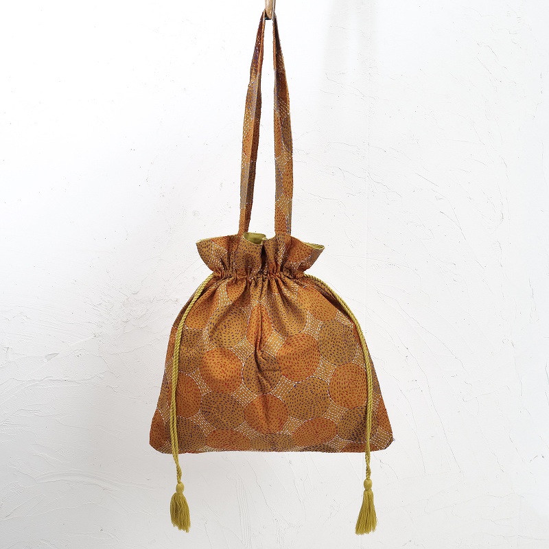 シルク生地にラウンド、スクエア、ラインステッチなどの刺し子が施された巾着バッグ。生地の魅力を活かしたシンプルで使いやすい形で、ちょっとしたお出かけの時に持ち歩くのにぴったり。小さめのトートサイズですが、ペットボトルが縦に入ります。普段持ち歩くバッグに入れて、サブバッグとて使うのもおすすめ。