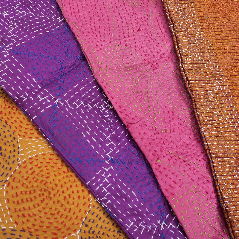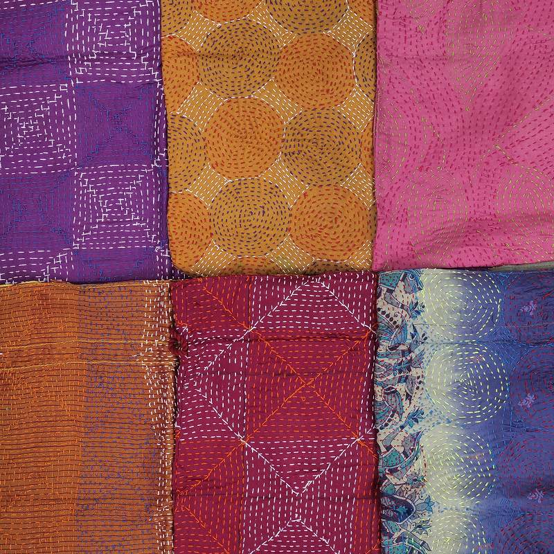 グドゥリー(Gudri)は西インドのグジャラートからきた刺し子を示す言葉です。別名ラリーキルトとも。着古した布を補強するため、二枚重ねにして布を繋ぎ上から刺し子を施していきます。 ものを大事にする心から生まれたこの伝統技法により、時間と手間をかけて布が新しく生まれ変わります。