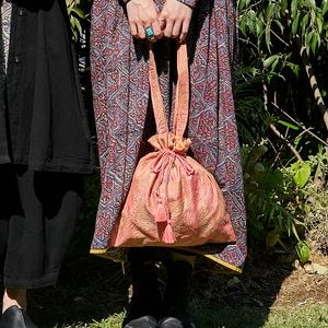 シルク生地に施されたステッチが魅力の巾着バッグ