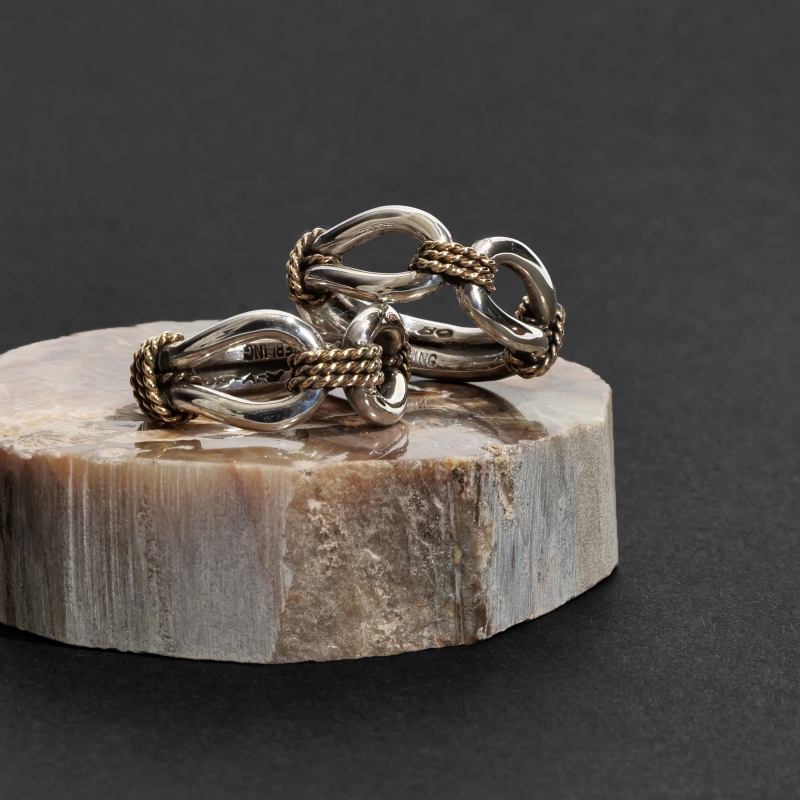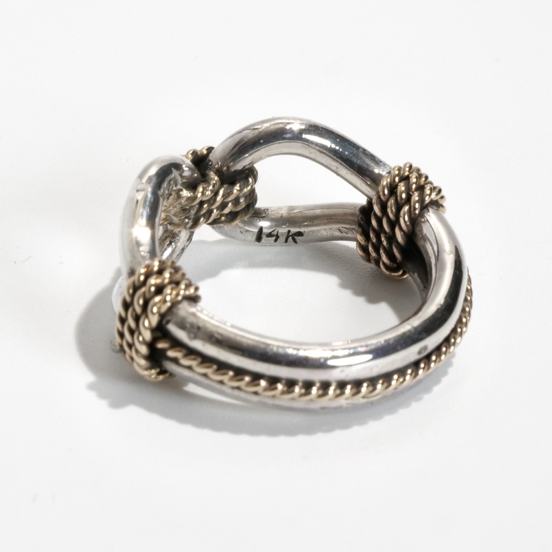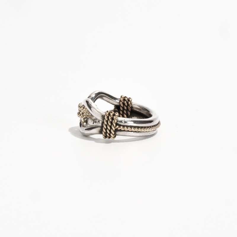 スティーブアルビソの14金使用ホースウィスパラーリングです。スティーブの代表作・ホースウィスパラーのノット部分にツイステッドの14金ワイヤーを使用したラグジュアリーモデル。馬具からインスピレーションを受けたデザインで、馬へささやくように語りかけ馬と人との心をつなぐ、そんなイメージから作られたジュエリー。カウボーイとして馬を調教することの多い、スティーブならではの名品です。
