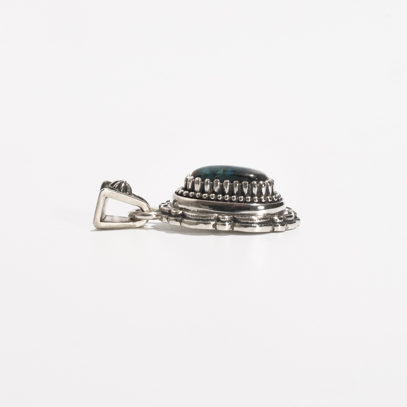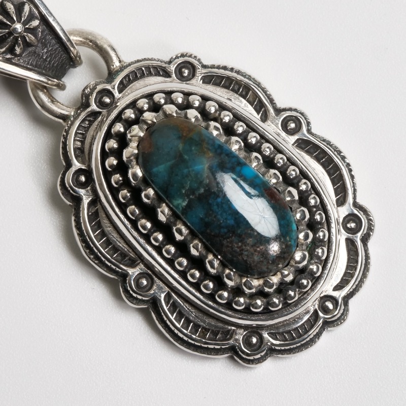 堀江純作・ビズビーペンダントです。複雑なマトリックスの奥からスーパーブルーがのぞくハイグレードビズビーをトップにあしらい、ハンドメイドベゼルと5層のフレームで装飾した重厚な豪華仕様。バチカンもコンチョ付きの手の込んだ仕立てで隙なし。ターコイズの良さもシルバーワークの見事さも、どちらも引かずお互いに引き立てあう素晴らしい細工です。モノの良さを知る大人の為のジュエリー。