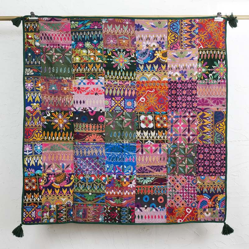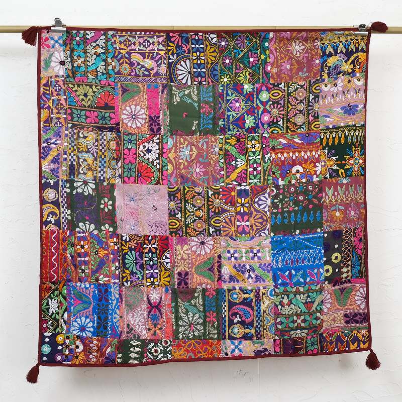 インド・グジャラート州カッチ地方で女性のドレスや室内装飾布として使われてきた刺繍の良い部分を選び集めたパッチワークファブリック。正方形で四隅にタッセル付き。テーブルクロスのほか、壁にかけたり、敷物や小さめのソファカバーとしてインドらしい雰囲気を楽しめます。幸運や豊穣、魔除けの祈りが込められた刺繍布は縁起が良く、砂漠地帯のカッチ刺繍ならではの華やかな色彩が、お部屋を明るくしてくれます。