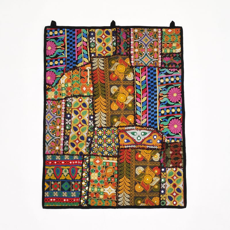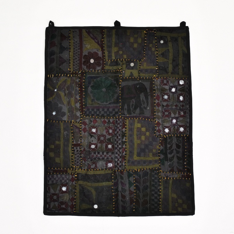 インド・グジャラート州カッチ地方で女性のドレスや室内装飾布として使われてきた刺繍の良い部分を選び集めたパッチワークファブリック。小さめサイズのタペストリーで、ループを使って壁にかけたり、飾り棚スペースや小さめの敷物としてインドらしい雰囲気を楽しめます。幸運や豊穣、魔除けの祈りが込められた刺繍布は縁起が良く、砂漠地帯のカッチ刺繍ならではの華やかな色彩が、お部屋を明るくしてくれます。
