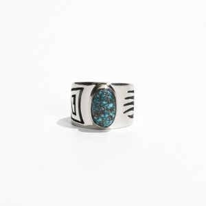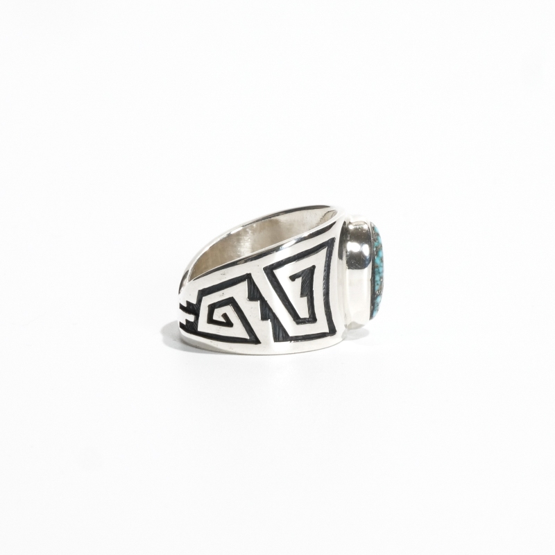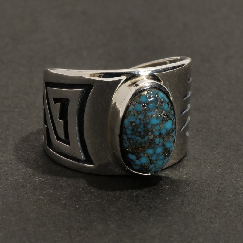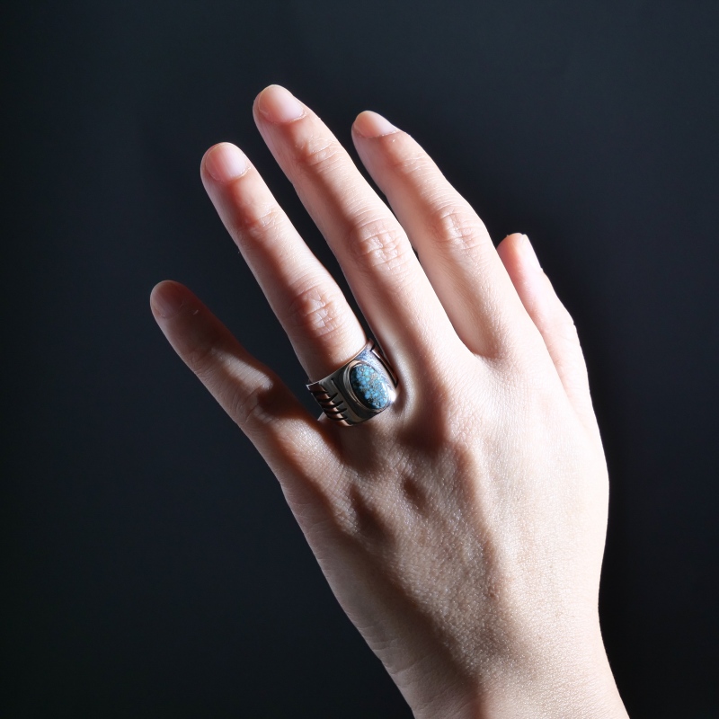 ルービンソウフキーのオーバーレイリングです。こちらはターコイズを用意し特別オーダーした1点で、トップにブラックウェブにパイライトが入った渋いキングマンターコイズ、シャンクは鏡面シルバーにハンド(もしくはバッジャーパウ)と水の流れが描かれ、ルービンらしい力強く美しいカッティングが楽しめます。エッジは丁寧に研磨され滑らか、幅広ですが背面にかけテーパーダウンされており、着け心地の快適さにも心を配った良作です。