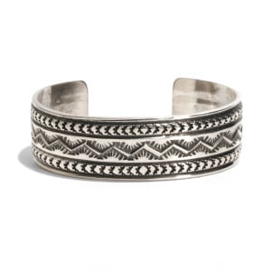 サンシャインリーブスのスタンプワークバングルです。程よくボリュームがある鏡面シルバーに、サンシャインらしい密なスタンプワークが打ち込まれた定番人気の作品。エンドまで抜かりなく打ち込まれている様は圧巻です。わずかにドーム仕立てになっており、スタンプの隙間からのぞく銀の輝きも十分に堪能でき、一本でも存在感のあるバングル。