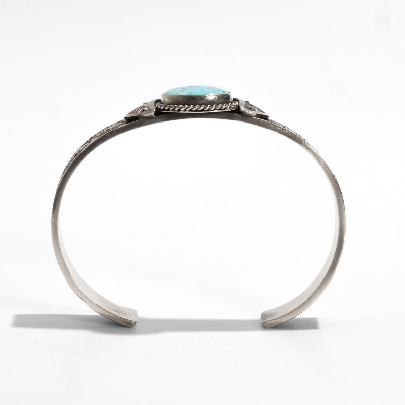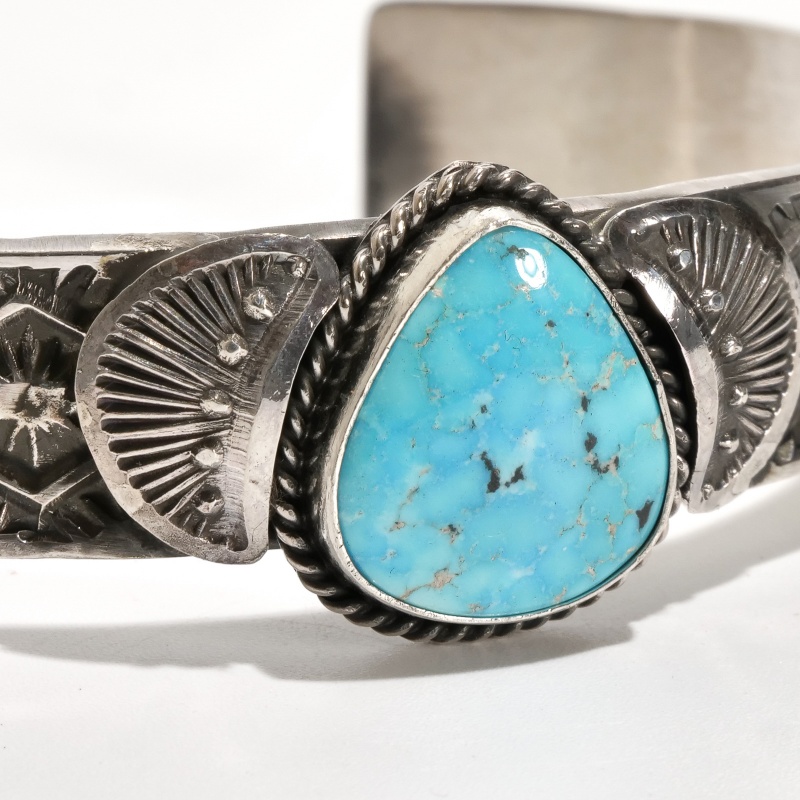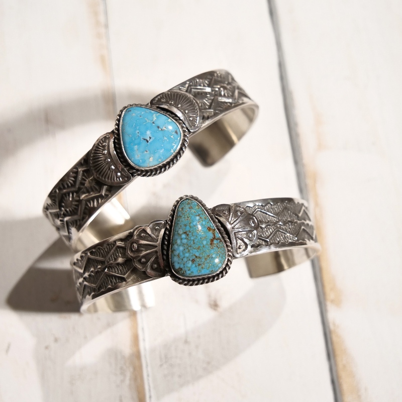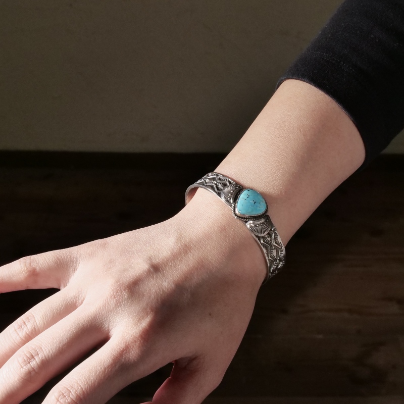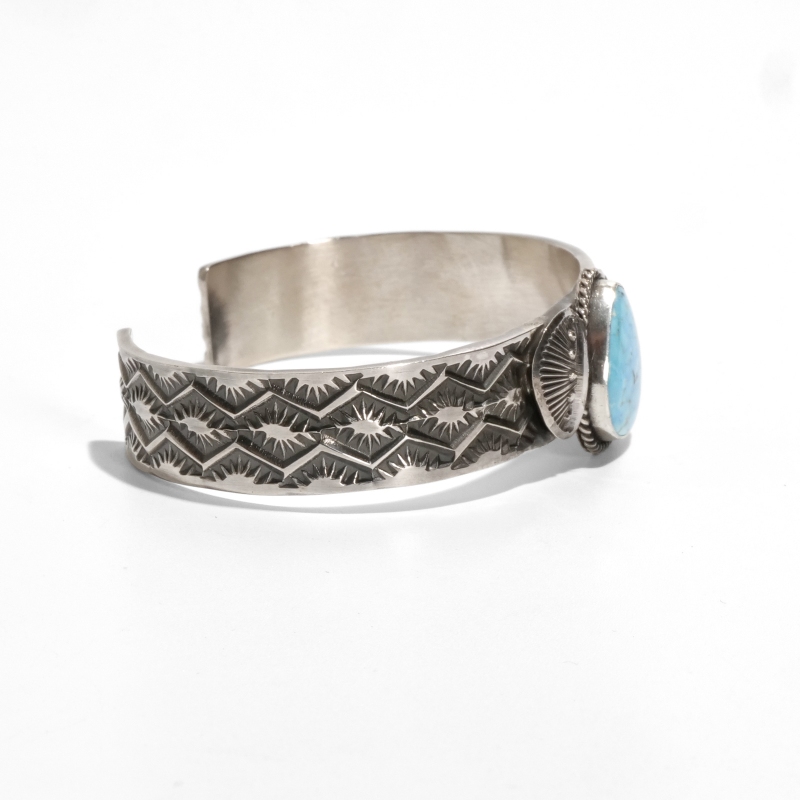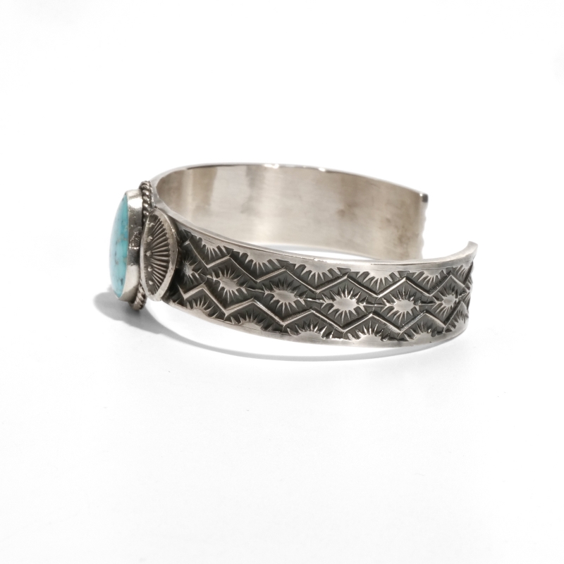 サンシャインリーブスのターコイズバングルです。鮮やかなターコイズブルーのウォーターウェブキングマンターコイズがセットされた作品です。人気のハーフインチ幅の鏡面アームにはサンシャインらしい連続スタンプ、エンドまで密に打たれています。ターコイズもサウスウエスト感も存分に味わえる王道ジュエリー。