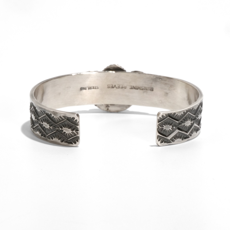 ナバホ族。1966生まれ。1990年制作開始。本名はDaniel Reevesだが、彼の陽気な性格に起因するニックネーム”Sunshine”を気に入りそのままアーティスト名として使っている。兄にゲーリーリーブス、息子にディレインリーブス、異父兄弟にキャドマン兄弟。スタンプを組みあわせラグを織り上げるように一面に文様を打ち出してゆくオールドスタイルを得意とし、銀食器やボックスなど大規模アートピースの立体造形も得意とする。近年はスターやアローなどナバホの定番モチーフをシンプルにあしらったシリーズで人気が高い。2017年マライカにてイベント開催。