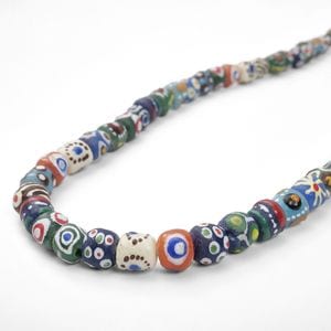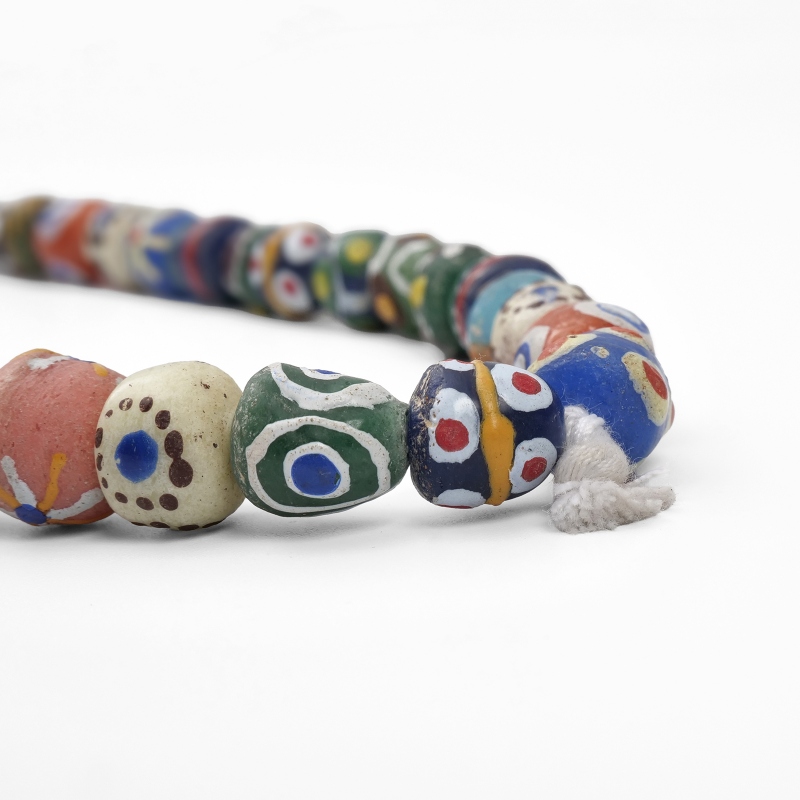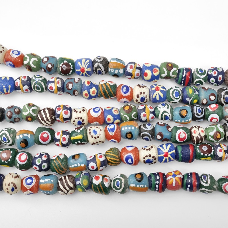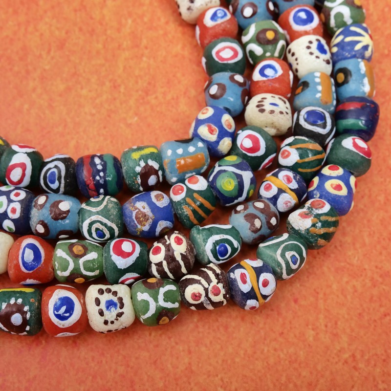 ガーナ産ガラスビーズの1連です。西アフリカ、特にアシャンテ族やクロボ族によって作られるこのビーズは、「アシャンテビーズ」「クロボビーズ」とも呼ばれています。100年ほど前、アフリカ諸国に輸入され、金やパーム油と交換されていた高価なトレードビーズへの憧れから、女性たちのために作られ始めたといわれています。1900年代から現代に至るまで、手仕事の伝統は受け継がれ、日常生活だけでなく誕生・成人・結婚・葬儀など、さまざまな儀礼に深く関わってきました。廃ガラスをすり鉢で細かく砕き、粘土の型とキャッサバの茎を使って成形したパウダーガラスビーズに、細い木の棒で手作業の装飾を施して作られます。そのため、ざらつきのある独特の質感や、同じものがひとつとしてない模様が大きな魅力です。ラフィアで束ねられており、そのまま飾っても雰囲気があるため、インテリアにもおすすめです。ハンドクラフトのパーツとしてはもちろん、紐を通してネックレスに仕立てたりするのもおすすめです。