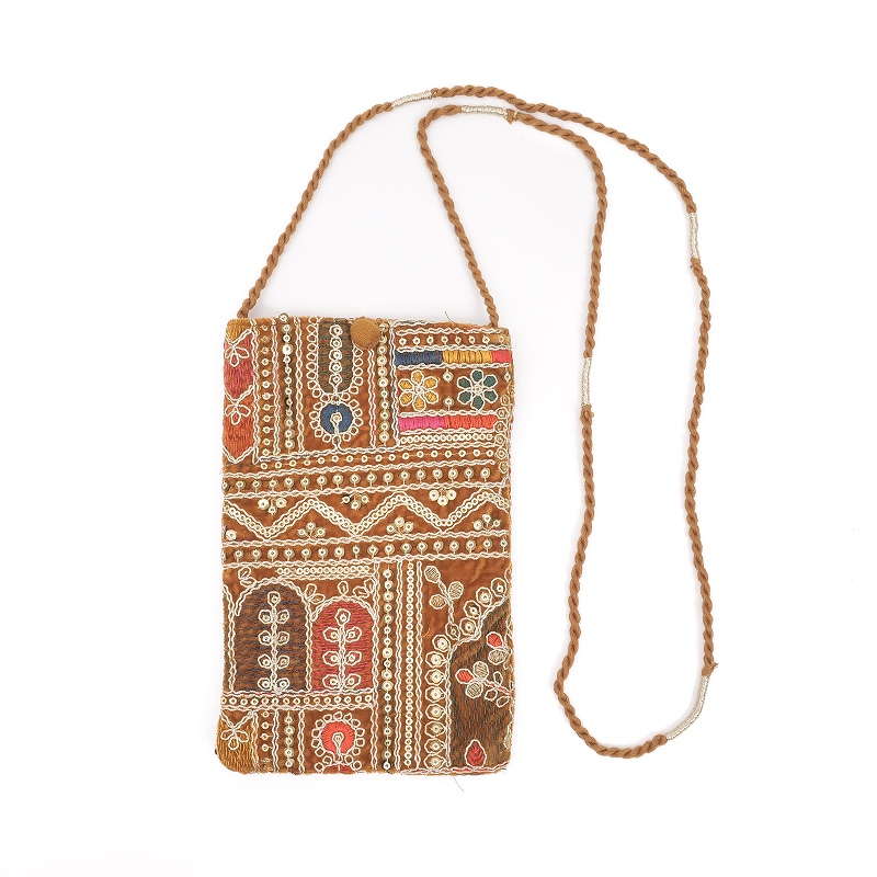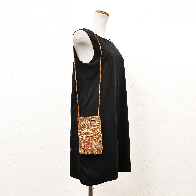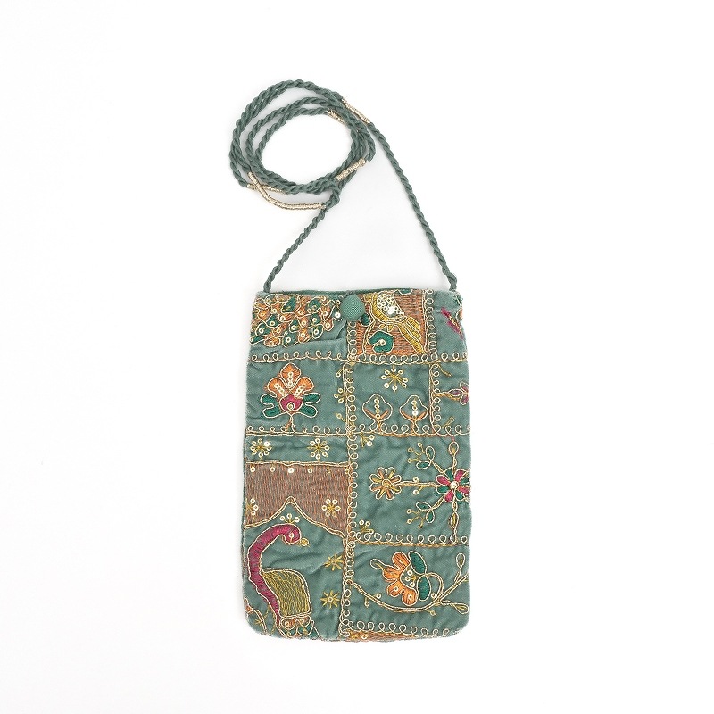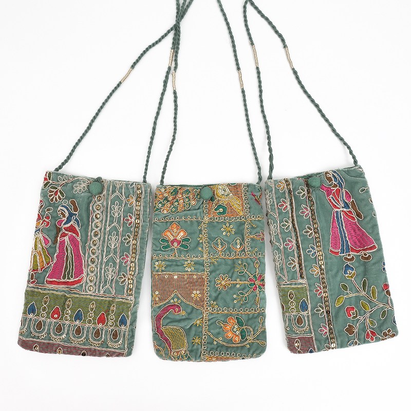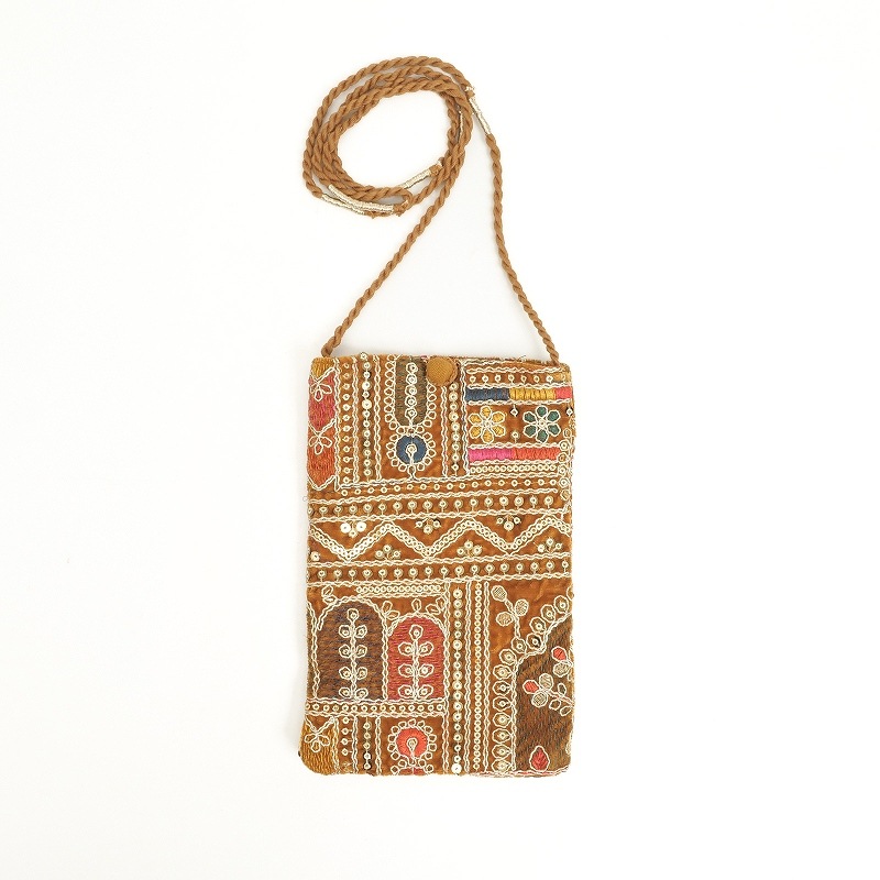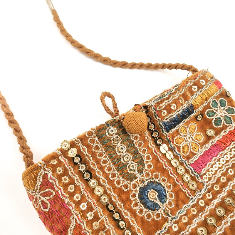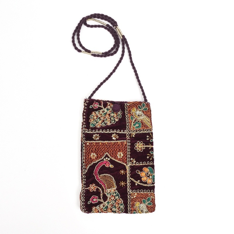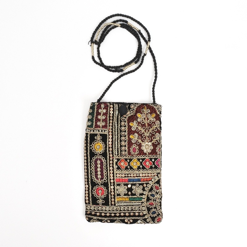 ベルベット素材に金糸や銀糸、様々な色糸とスパンコールで刺繍を施したショルダーポーチ。フラットな形で、スマホやカードケースがスッキリ収まります。イルミネーションのようなキラキラアイテムは、持つだけで気分もアップ。パーティーシーンや特別なお出かけにもおすすめです。刺繍の柄は物により異なります、どんな柄がくるかお楽しみに。