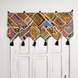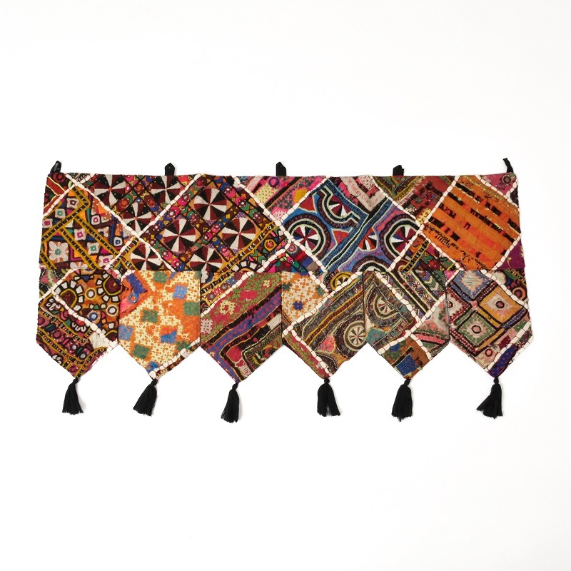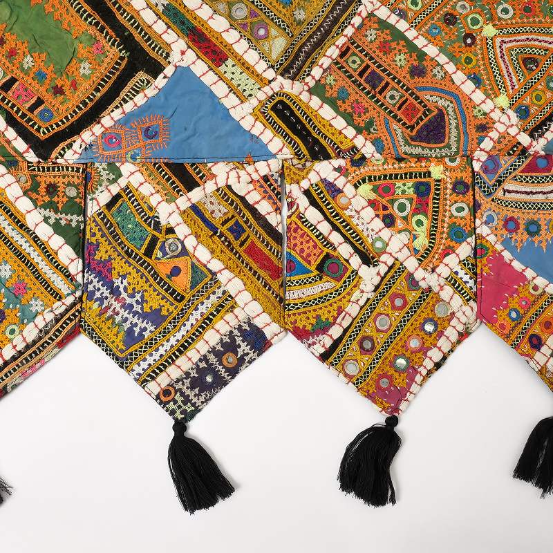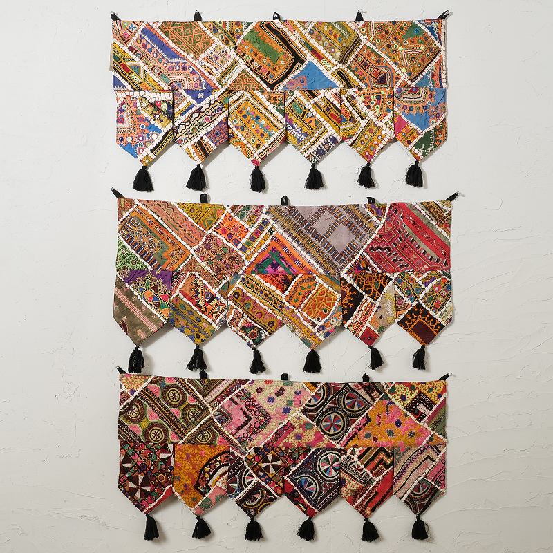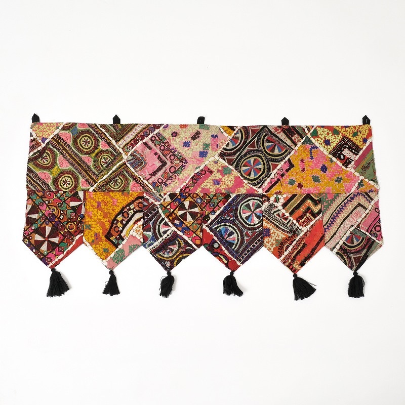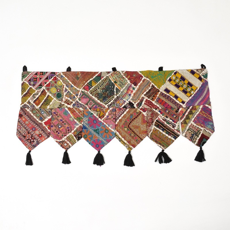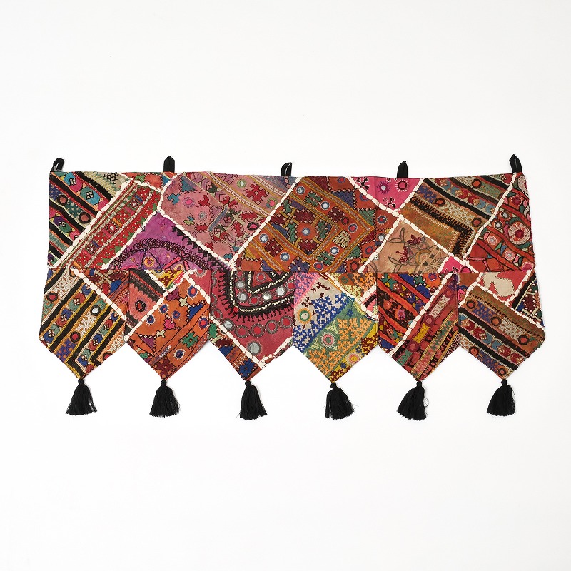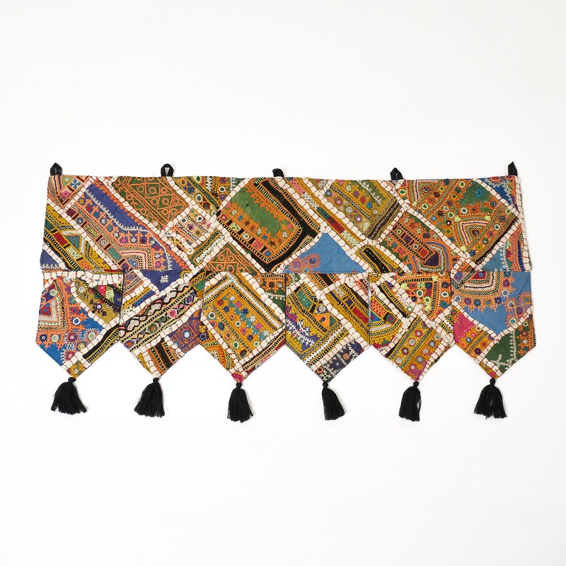 パキスタンの女性が身にまとう伝統的なドレスの刺繍部分をパッチワークにしたトーラン。トーランは玄関やお部屋の入り口に飾る、お守りのようなタペストリーで、幸運を招き入れる縁起物。華やかな刺繍が空間をぱっと明るく彩り、インテリアのアクセントとしてもおすすめです。