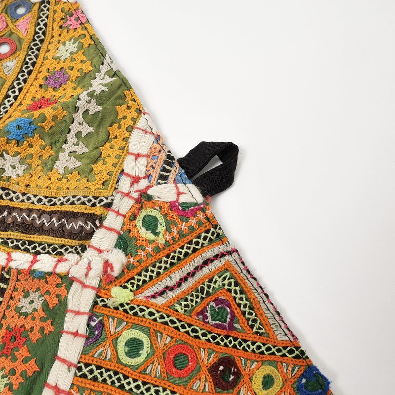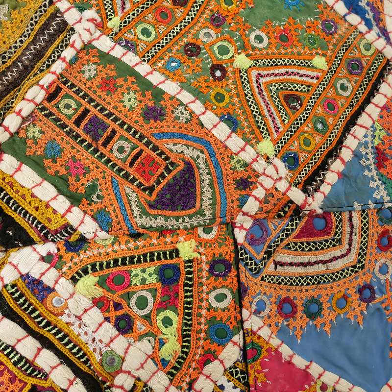 小さな鏡の周りを糸でかがって布にとめつける手法でシーシャワークとも呼ばれます。古くはペルシアを起源とし、イランからパキスタン、アフガニスタン、インド、インドネシアへ伝わったとされ、このルートは”鏡の道”と呼ばれています。 鏡は水と太陽の象徴であり、砂漠に暮らす民族の間では悪を反射し吸収するものと考えられていたため、魔除けや邪視除けとして衣服などに好んでつけられるようになりました。インドには刺繍を得意とするさまざまな民族が暮らしていますが、その多くがミラーワークを取り入れ、それぞれに特徴のあるデザインを生み出しました。
