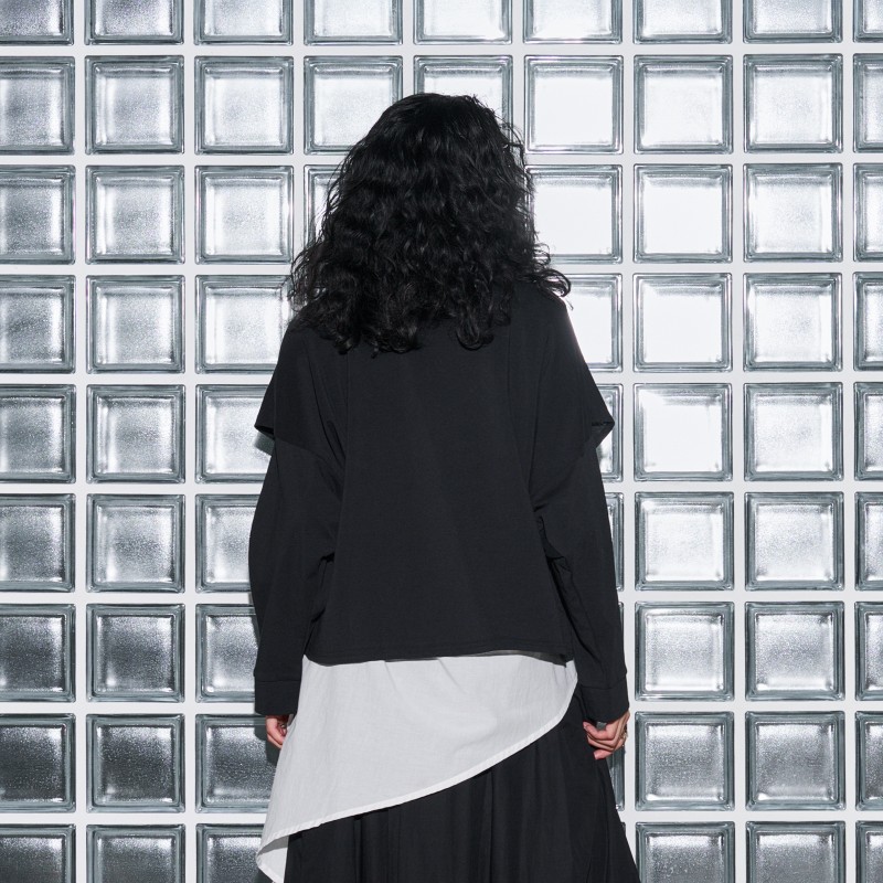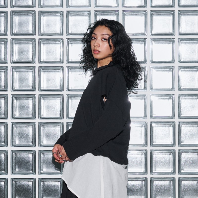 袖をカットオフしたデザインが印象的なプルオーバー。トレンドのクロップド丈に仕上げ、カットソー素材のシリーズはリラックス感のある着心地で、デイリー使いにピッタリ。アレンジ可能なデザインで、袖を後ろに回してボタンを留め、カットオフの部分に腕を通すと半袖にもなるアイテム。シャツやカラーインナーをチラ見せすることもできます。