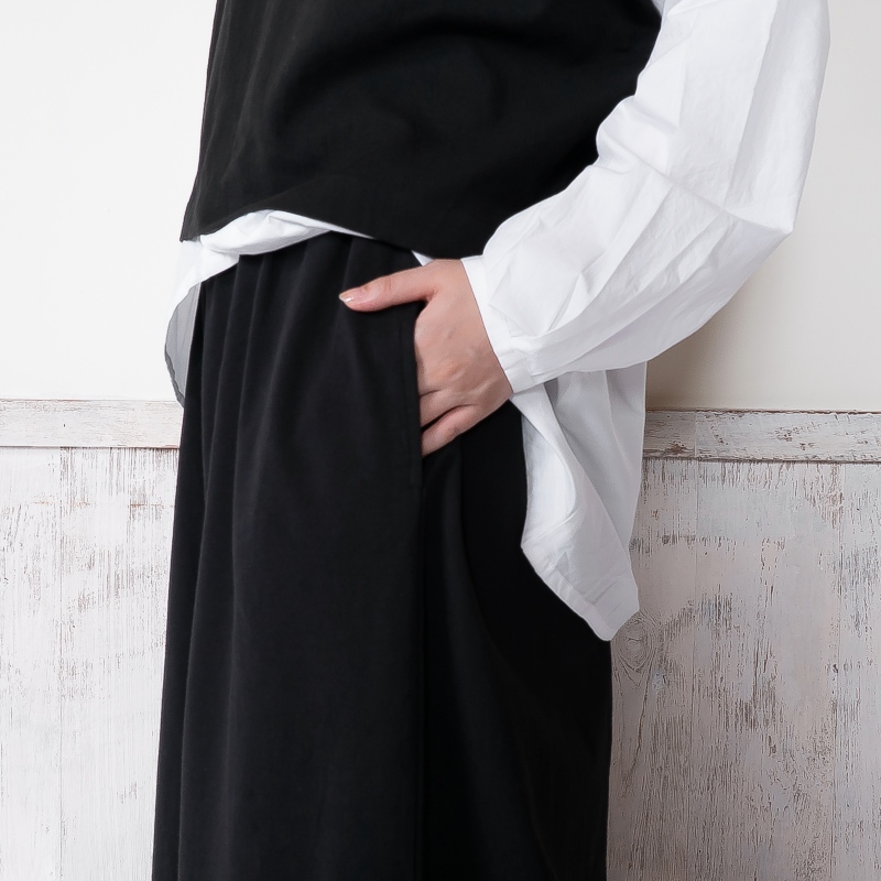 | 仕様 | ウエストゴム入りギャザー(ヒモ付き) アシンメトリーデザイン サイドポケット付き |